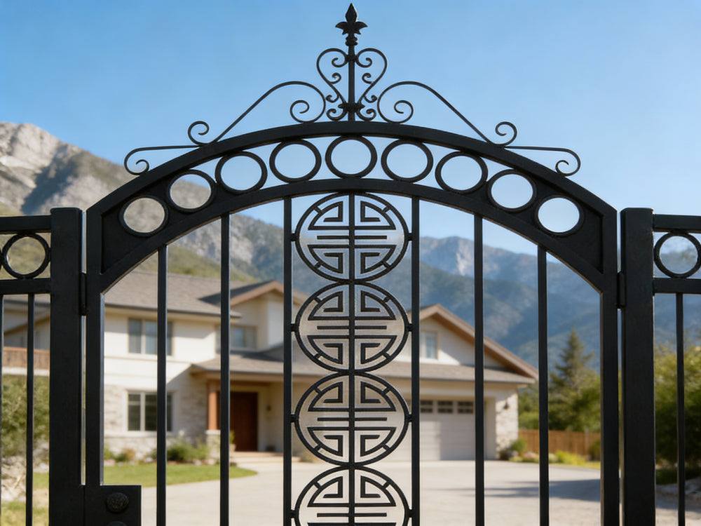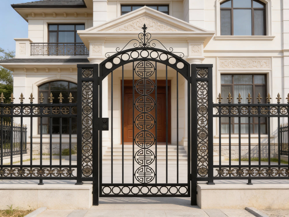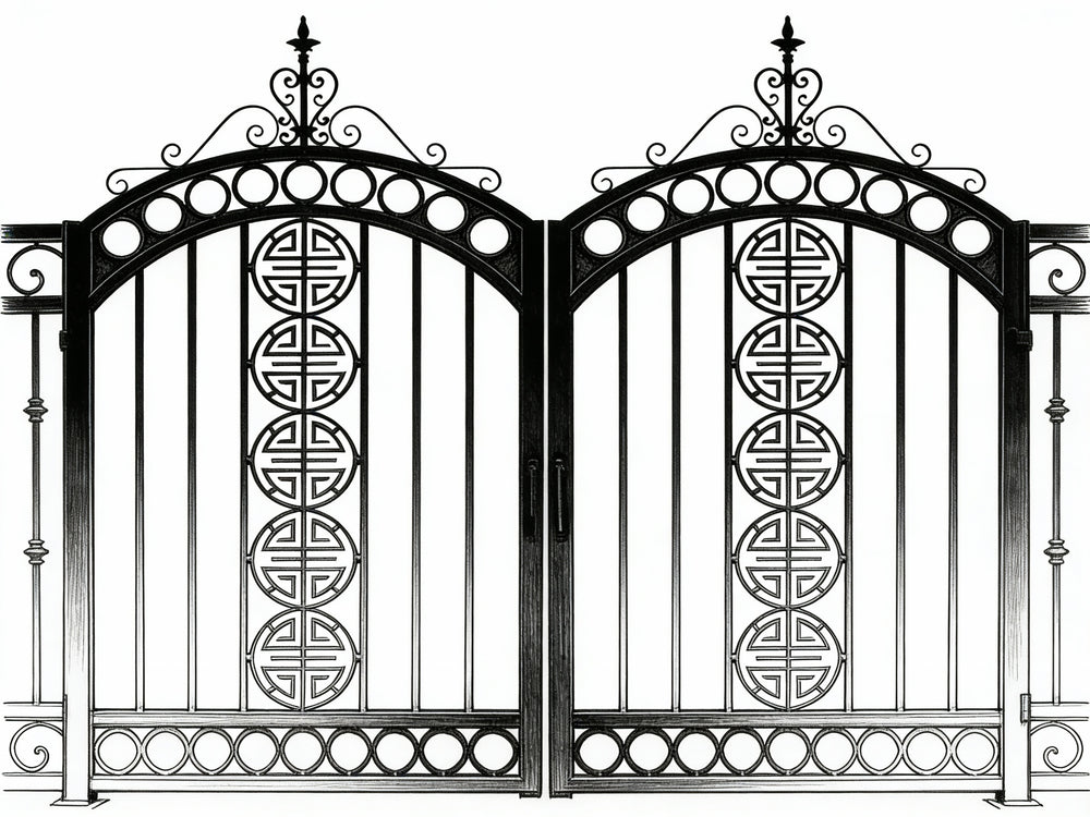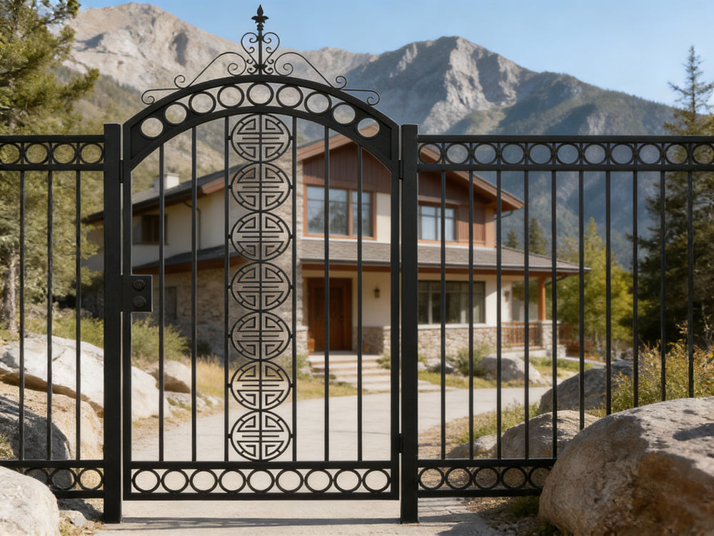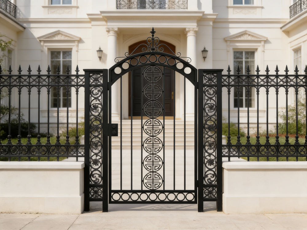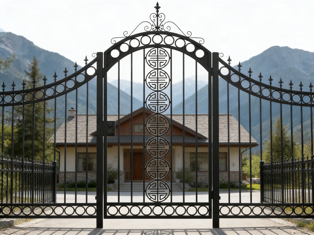 A door that honors tradition with precision. Circlecrest Passage features a symmetrical layout of vertical bars flanked by a central column of circular medallions, each containing geometric motifs reminiscent of cultural heritage. The arched top is crowned with scrollwork and circular cutouts, while the bottom panel echoes the medallion rhythm. Designed for garden entries, residential walkways, or courtyard transitions, this man door blends ornamental symbolism with secure craftsmanship.