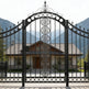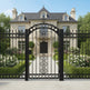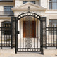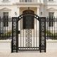 cultural medallion man door, ornamental wrought iron gate, arched scroll garden entry, Canadian custom gate, Taimco Circlecrest model, manual operation passage door