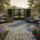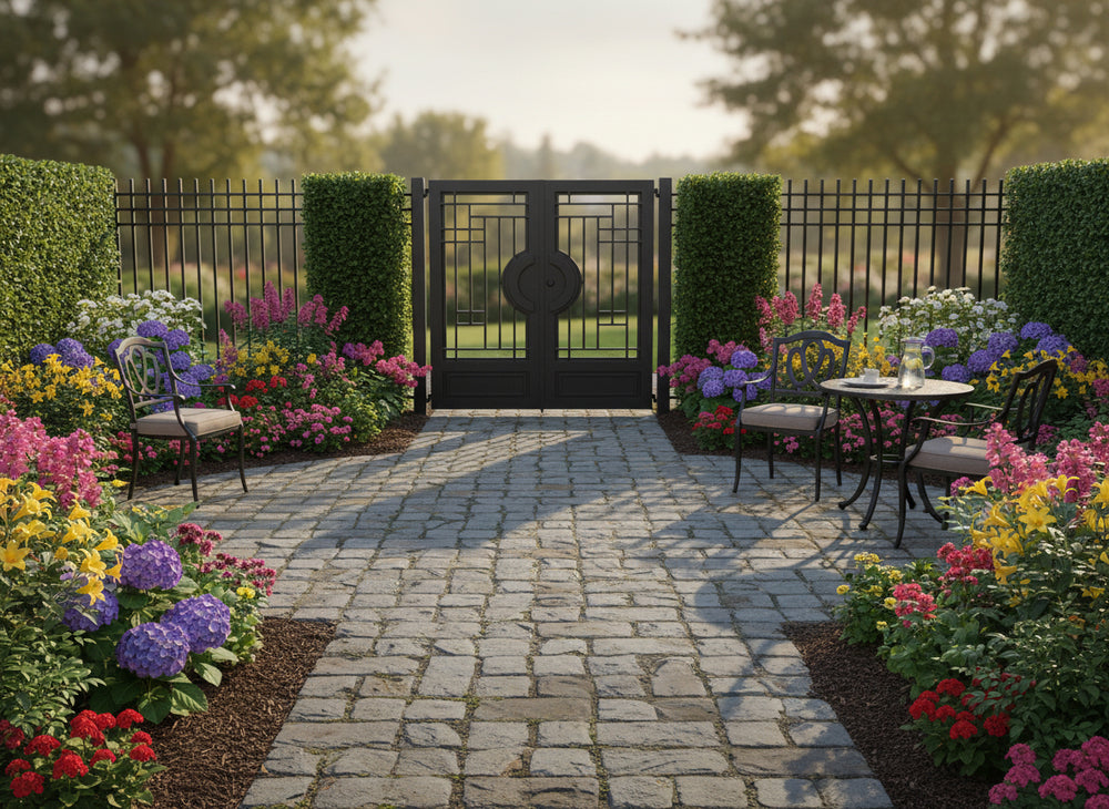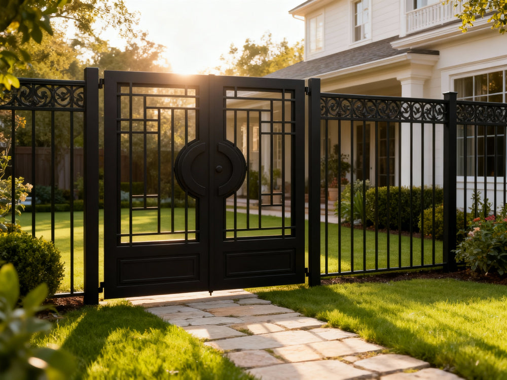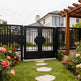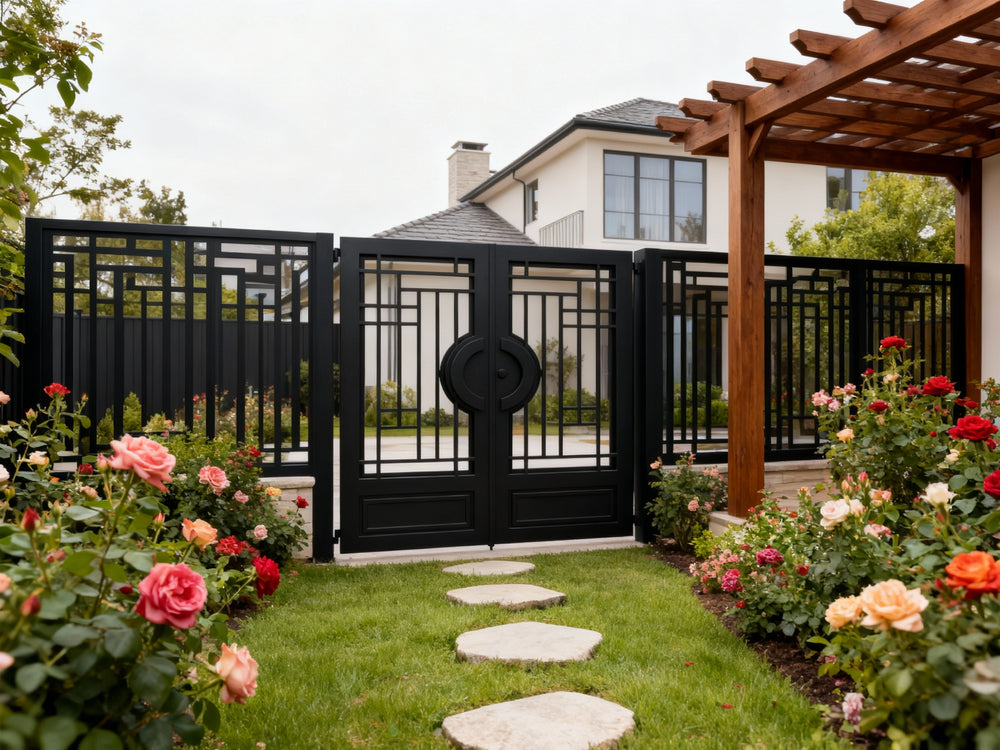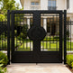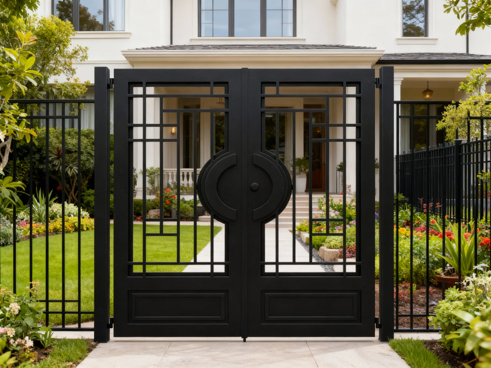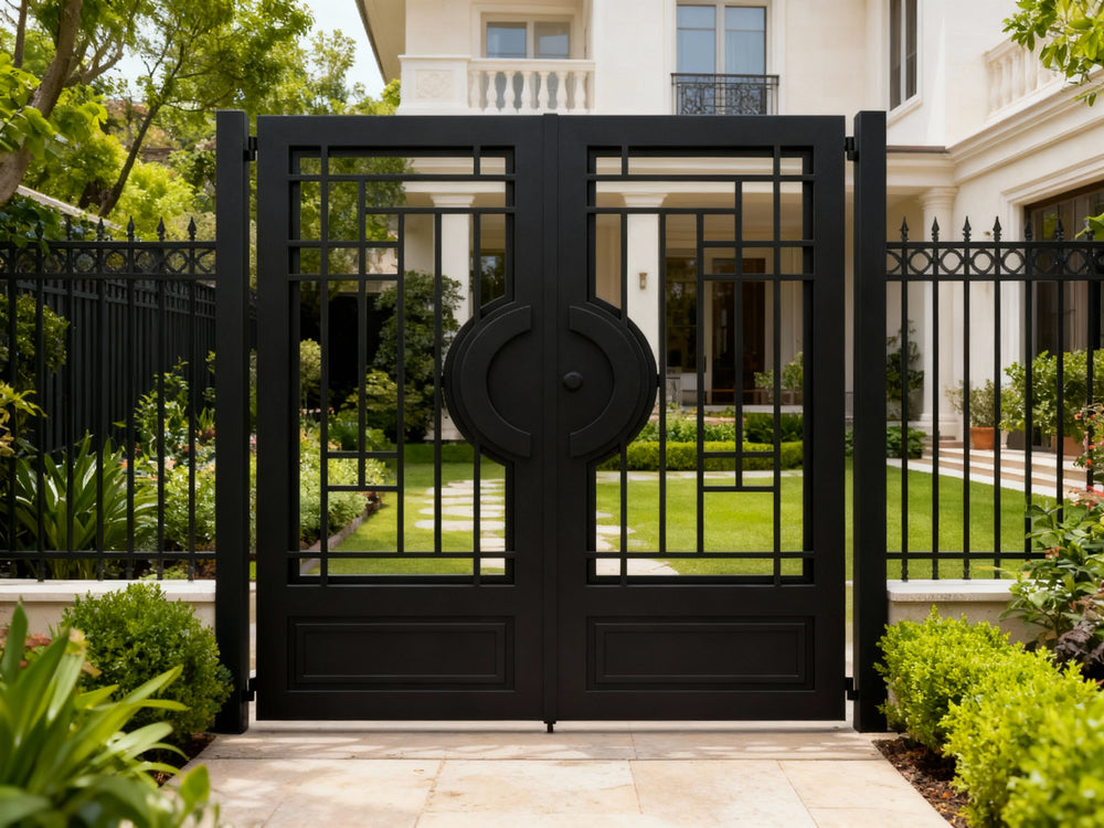 A door that balances geometry and gravitas. Circlegrid Passage features two symmetrical panels framed in black metal, each composed of vertical and horizontal bars forming a clean grid. At the center, a split circular motif completes when closed, offering visual unity and architectural symbolism. The lower section includes solid rectangular panels for structural weight and privacy—ideal for modern estates, commercial entries, or design-forward residential gates.