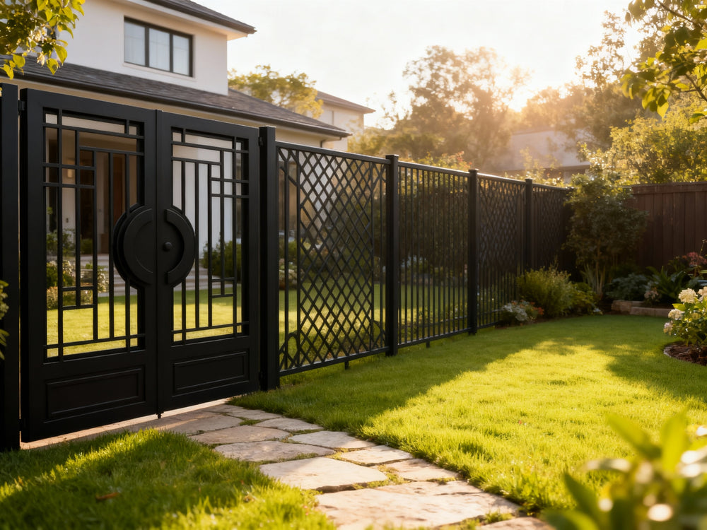 circular motif man door, geometric grid metal gate, modern double-panel garden entry, Canadian custom gate, Taimco architectural passage door, manual operation estate gate