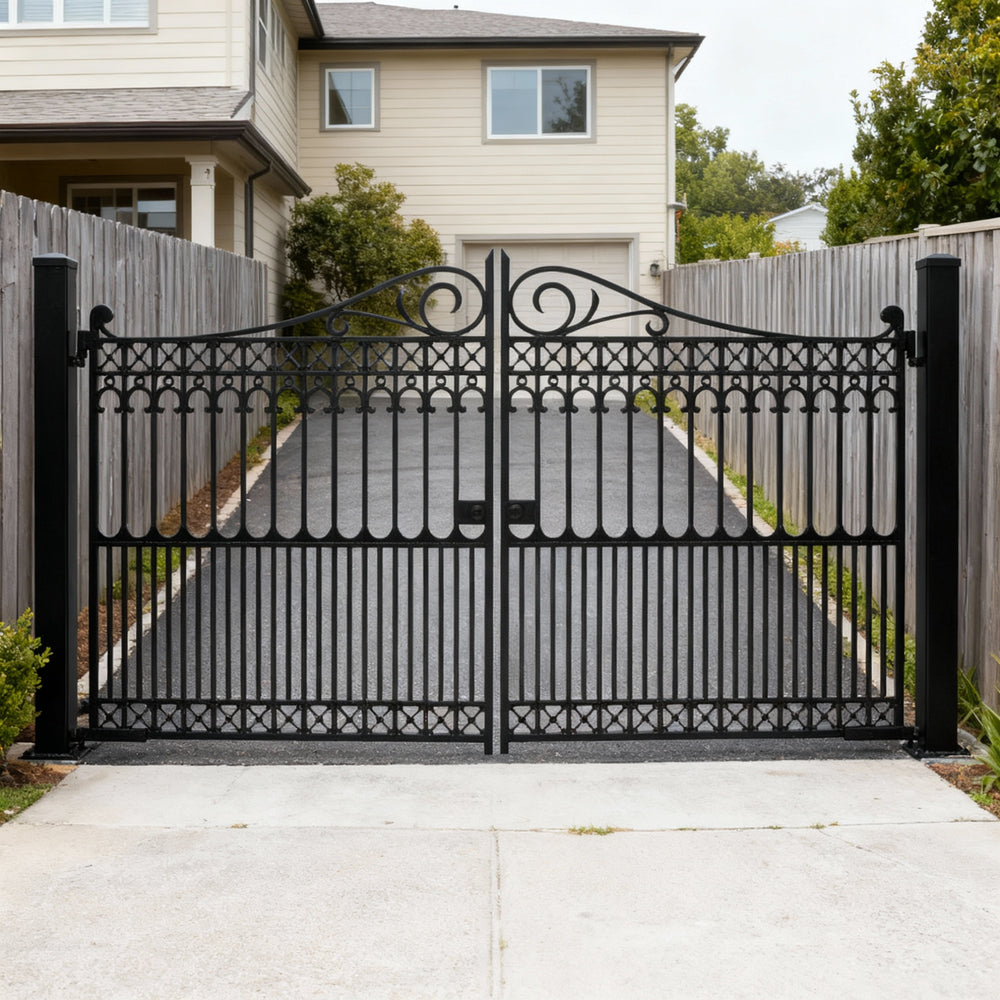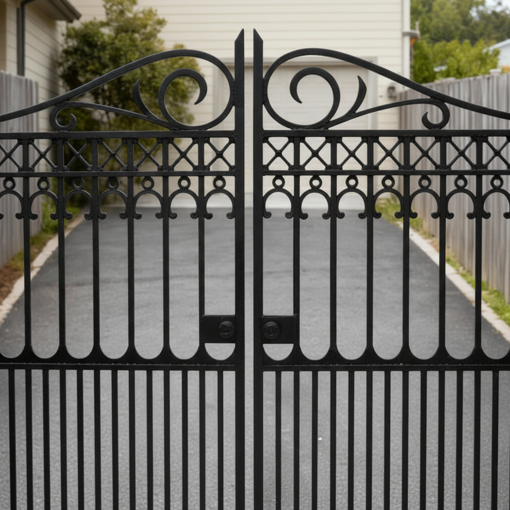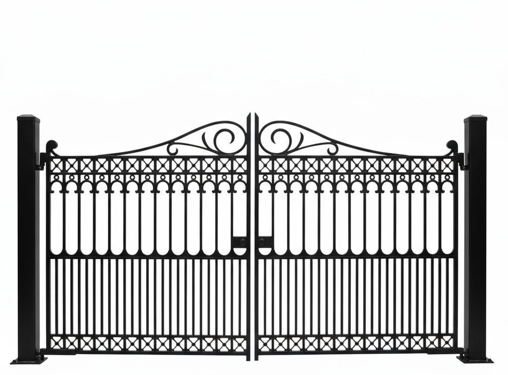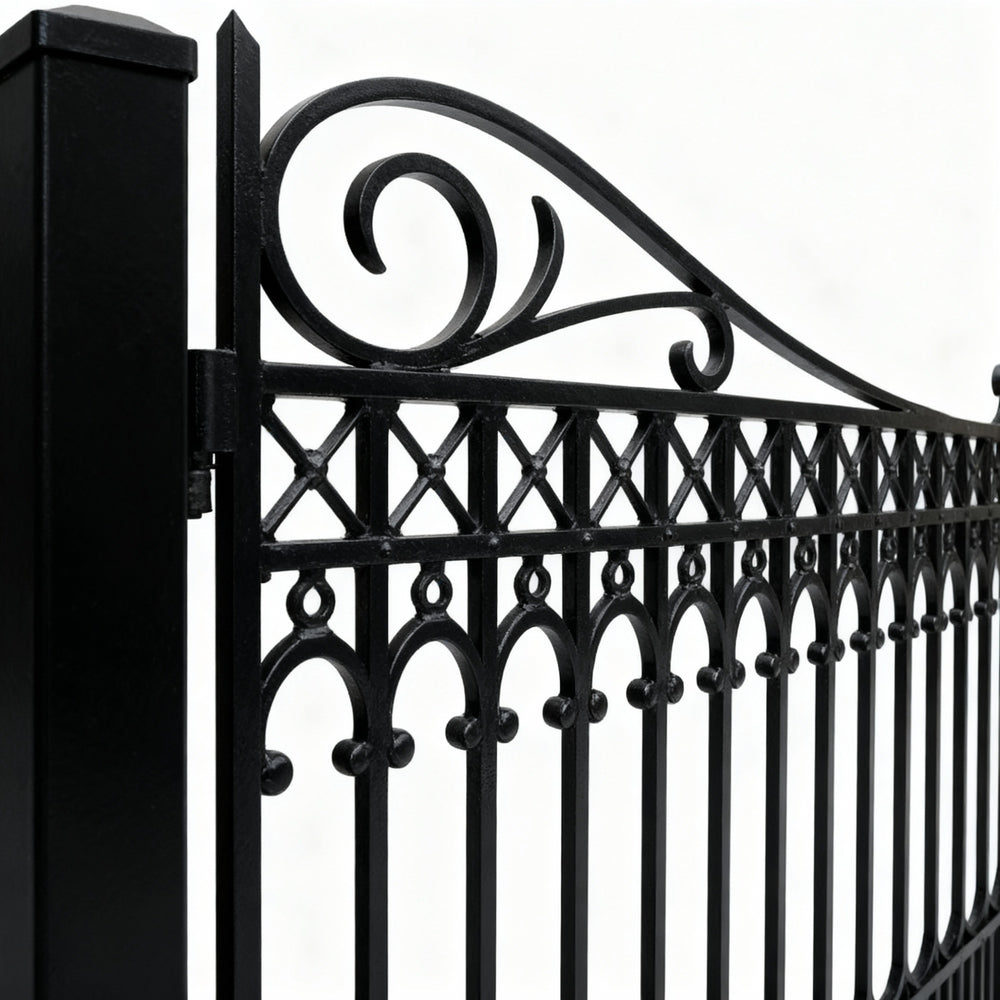 A gate that weaves strength into beauty. Circle weave Crest features dual swing panels with a graceful arched top, adorned with intricate scrollwork and a rhythmic row of circular accents. Vertical bars extend downward into a crisscross base pattern, offering both structural integrity and artistic flair. Flanked by sturdy black posts, this gate evokes balance, craftsmanship, and timeless appeal.