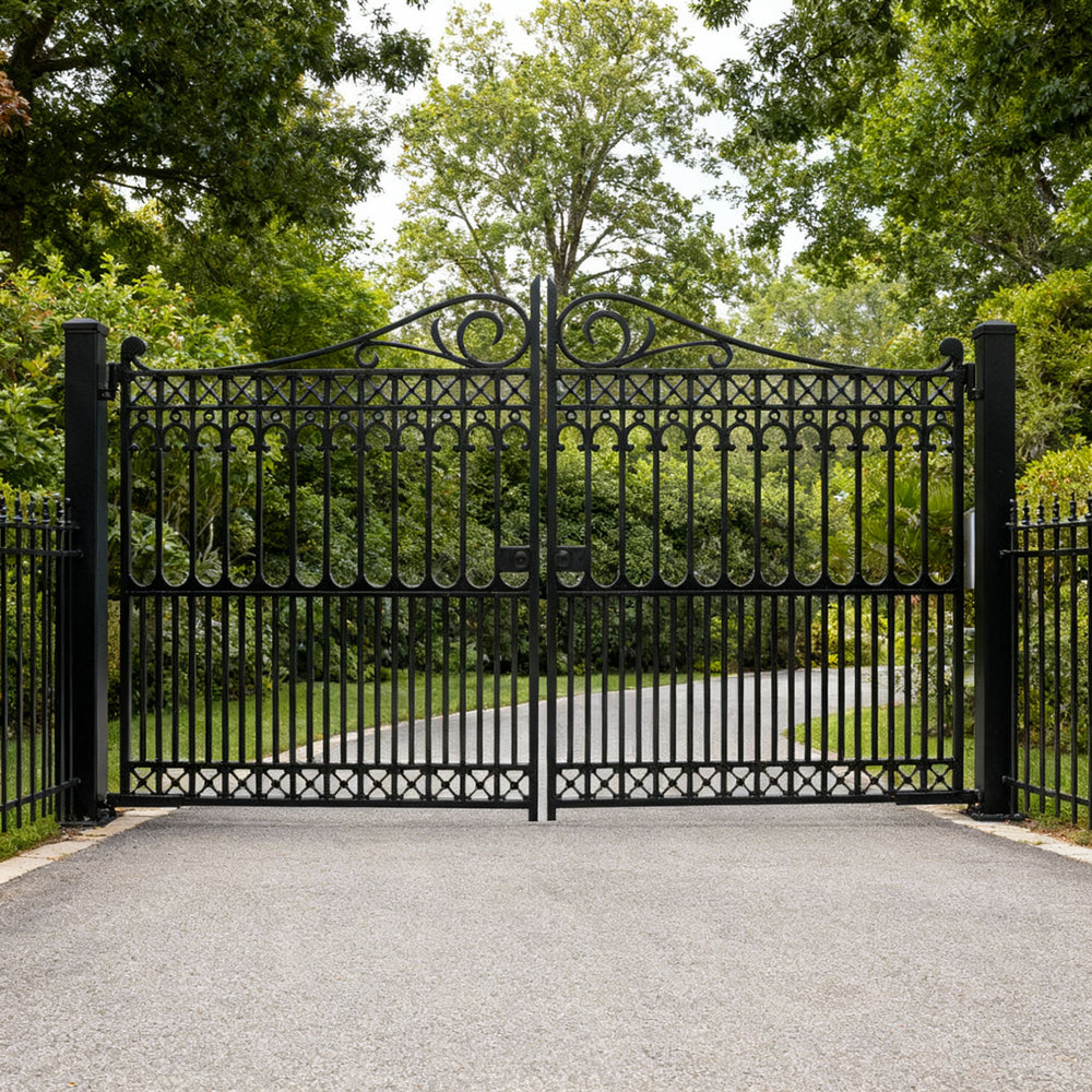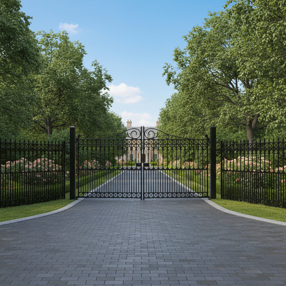 - Custom Crest: Optional monogram or estate emblem engraving, scroll and circle wrought iron gate, crisscross base driveway gate, Canadian custom gate, Taimco decorative gate, luxury property gate, geometric ornamental gate, heavy-duty artistic gate design