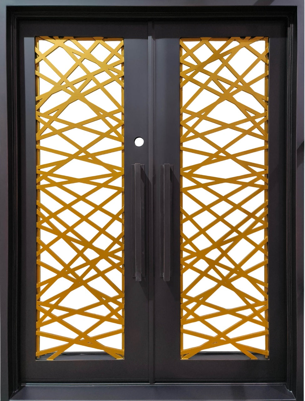 Step into modern luxury with the IWD 973 wrought iron double doors by Taimco. Featuring intersecting gold scroll lines across matte black panels, this eye-catching geometric design delivers artistic energy and architectural strength. Complete with central vertical handles and crafted from powder-coated galvanized steel, it's engineered to elevate any upscale entrance with lasting durability and high-style impact.