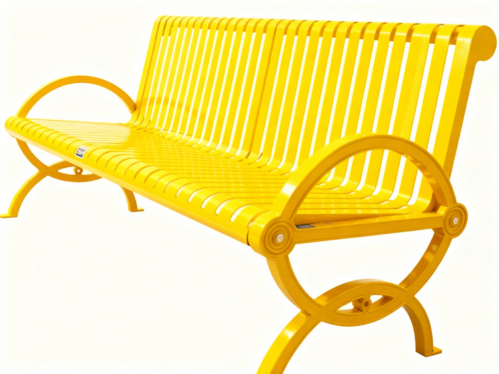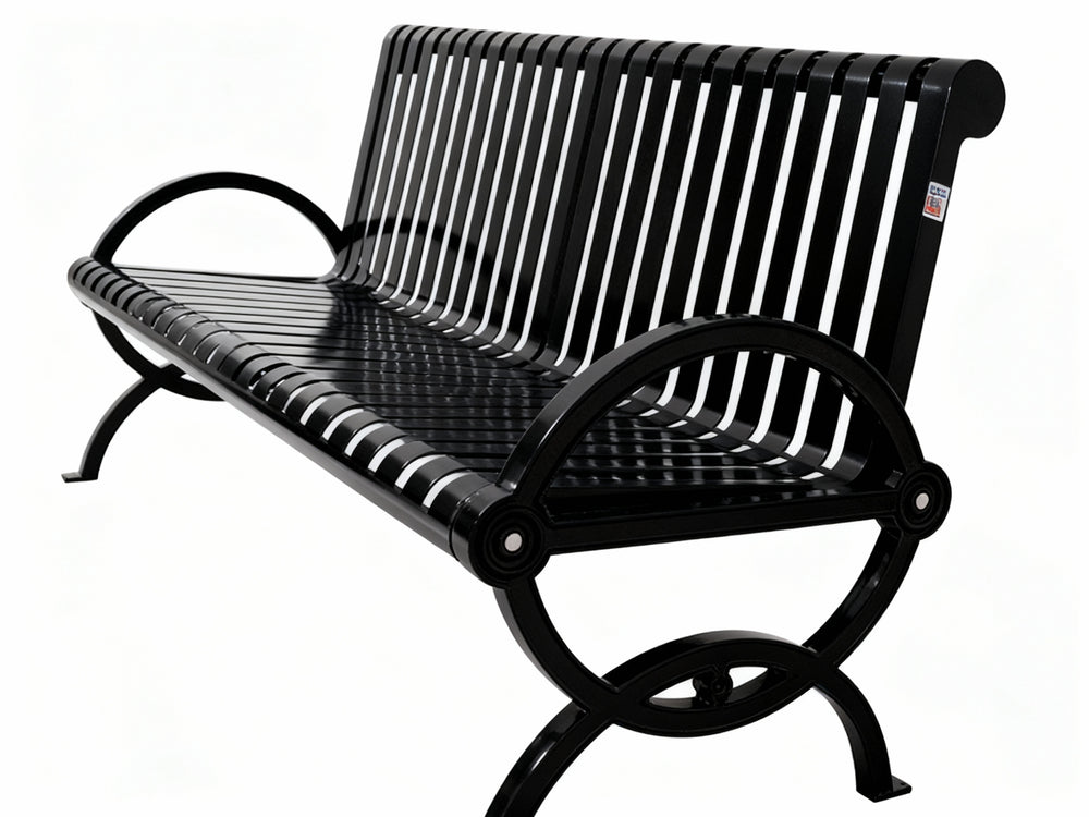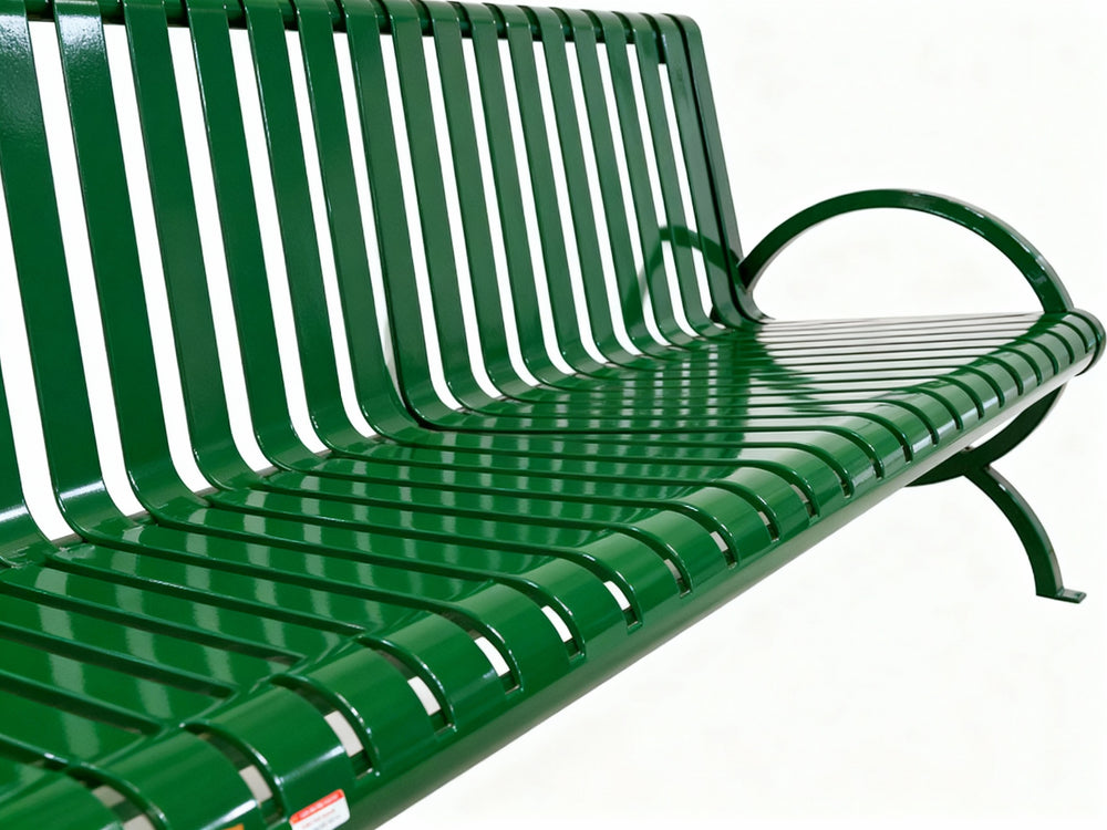 The benches from the Durham Collection, designed with vertical slats, blend aesthetic appeal with practical functionality, resulting in elegant and distinguished seating. These all-weather benches are equipped with stylish elliptical arms and a popular vertical slat bench seat assembly with a rolled-edge design.