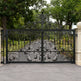 crest emblem wrought iron gate, floral scroll estate gate, spherical finial driveway gate, Canadian custom gate, Taimco decorative gate, luxury property gate, ornamental iron gate, heavy-duty artistic gate design