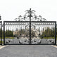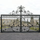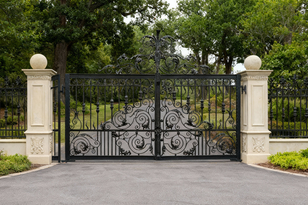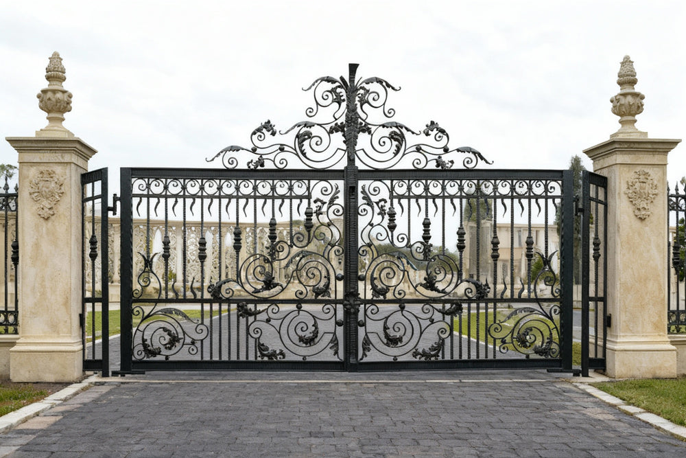 A gate that stands with distinction. Crest vale Arbor features dual swing panels adorned with mirrored floral and vine scrollwork, crowned by a central crest flourish and vertical finial. The lower section anchors the design with ornamental grounding, while the flanking brick pillars—each topped with a stone sphere—frame the entrance in timeless sophistication. This gate evokes heritage, artistry, and architectural prestige.