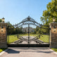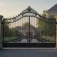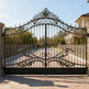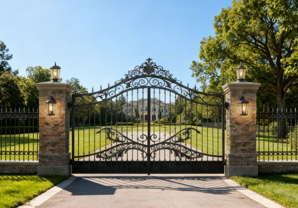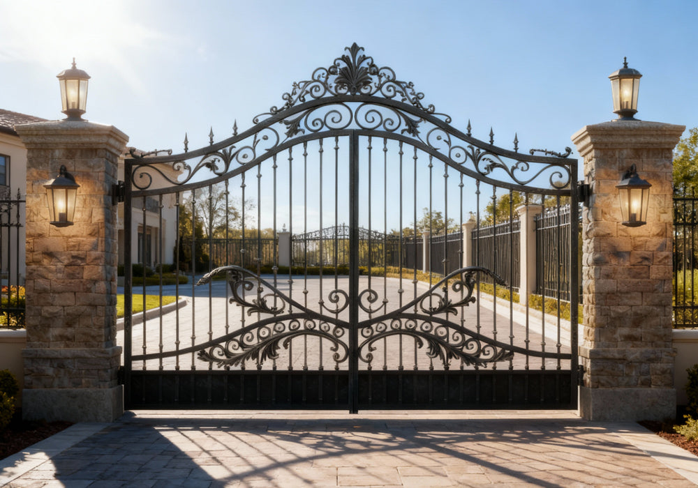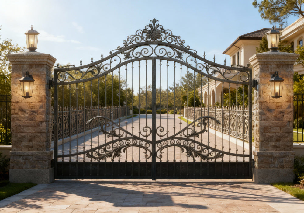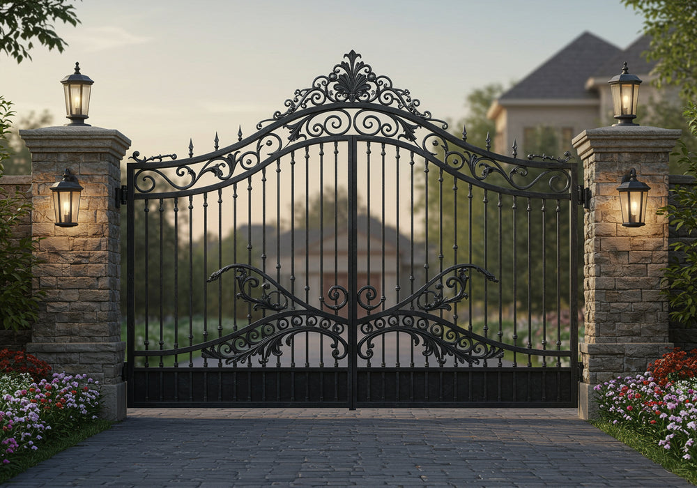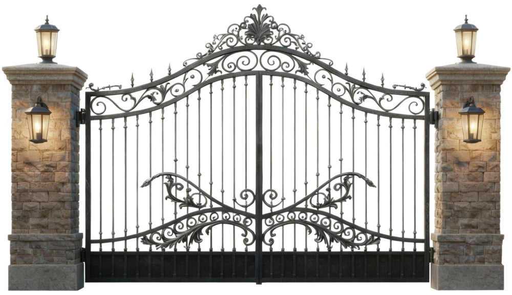 A gate that greets with grandeur and grace. Crestline Monarch features dual swing panels with vertical bars, floral scrollwork, and a central crest flourish. The arched top adds elevation and elegance, while the flanking stone pillars host dual lanterns—one perched above, one mounted midway—creating layered illumination and architectural rhythm. This design evokes nobility, craftsmanship, and timeless charm—perfect for entrances that blend symbolism with security.