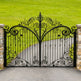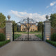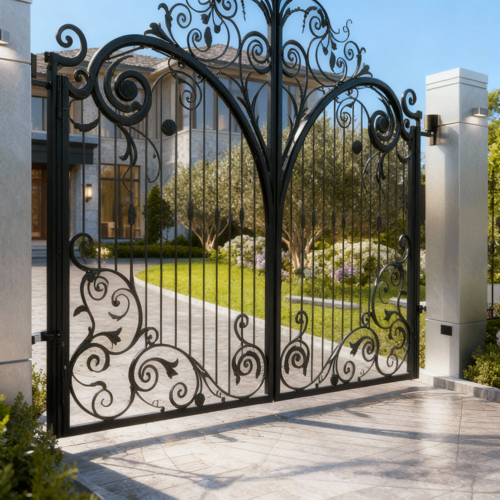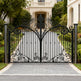 A gate that rises with authority. Crestspire Legacy features dual swing panels crowned by a central peak adorned with elaborate scrollwork and flourishes. Vertical bars run through the design, interspersed with ornamental accents that add rhythm and refinement. The central crest anchors the composition, offering a symbolic focal point for legacy, identity, or brand. Flanked by bold black pillars, this gate evokes grandeur, craftsmanship, and timeless strength