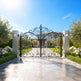 scrollwork wrought iron gate, crest emblem estate gate, arched driveway gate, Canadian custom gate, Taimco decorative gate, luxury property gate, ornamental iron gate, heavy-duty artistic gate design
