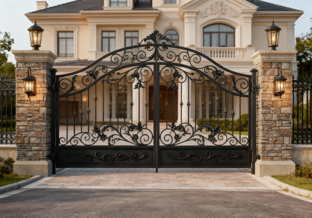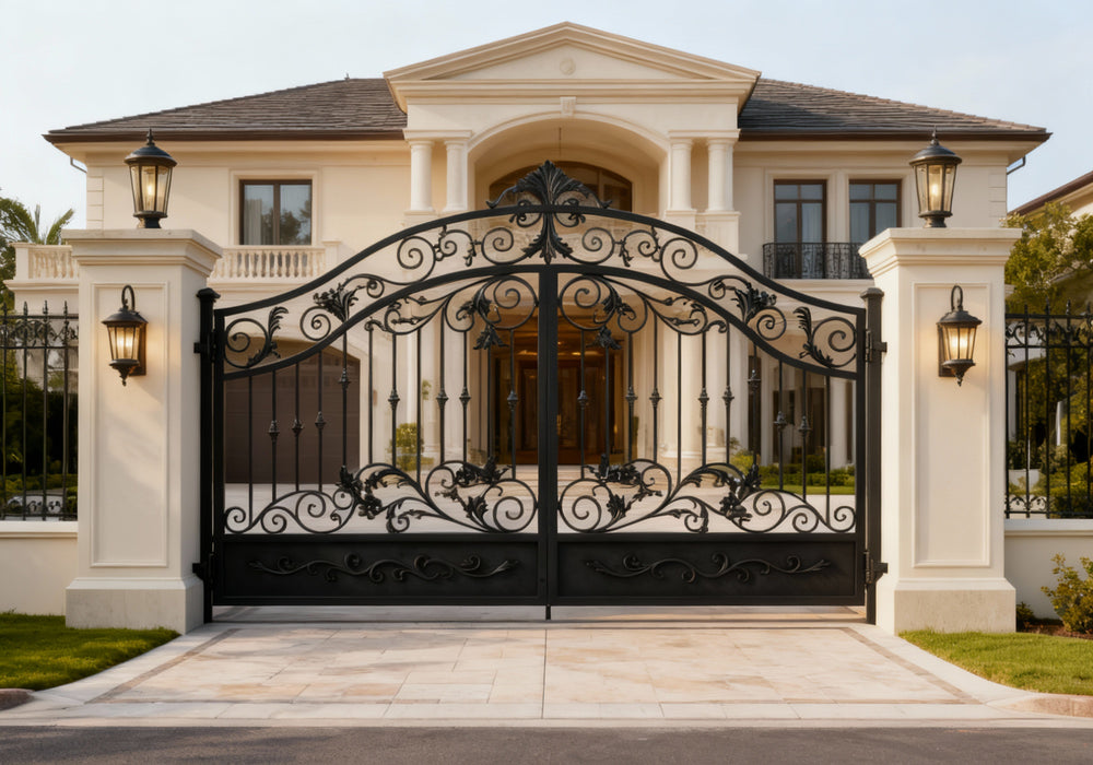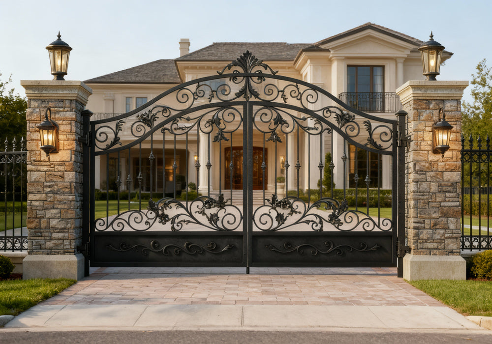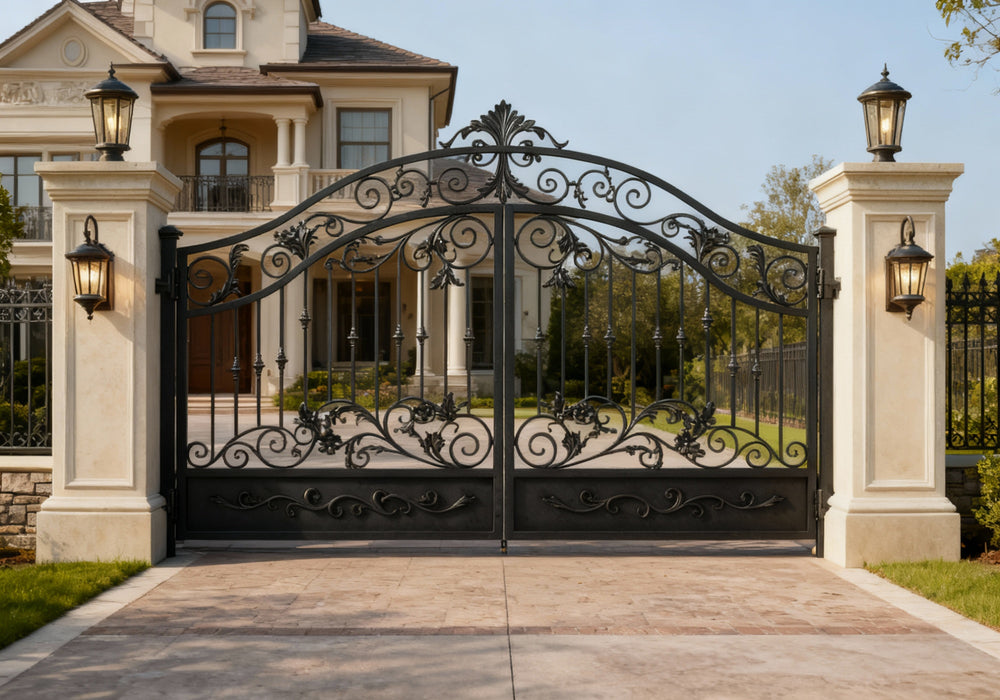 Crest veil Dominion – Ornate Wrought Iron Gate with Floral Scrolls Model # DWG127