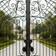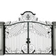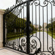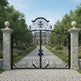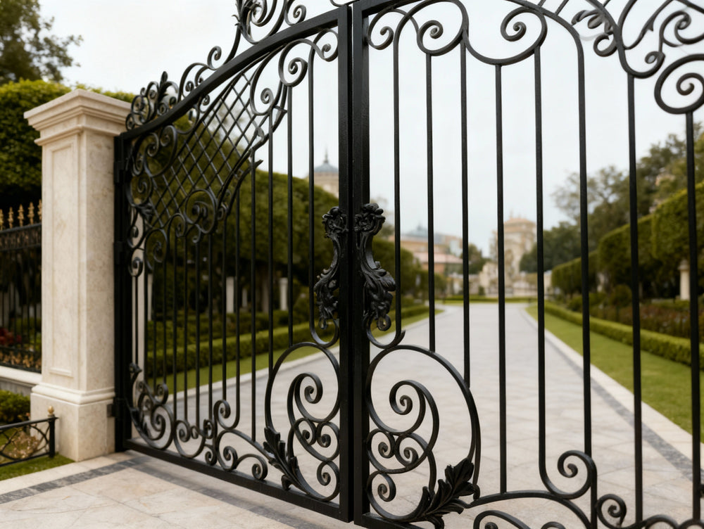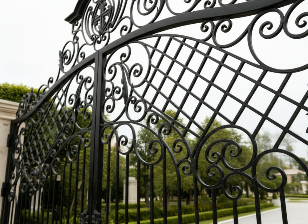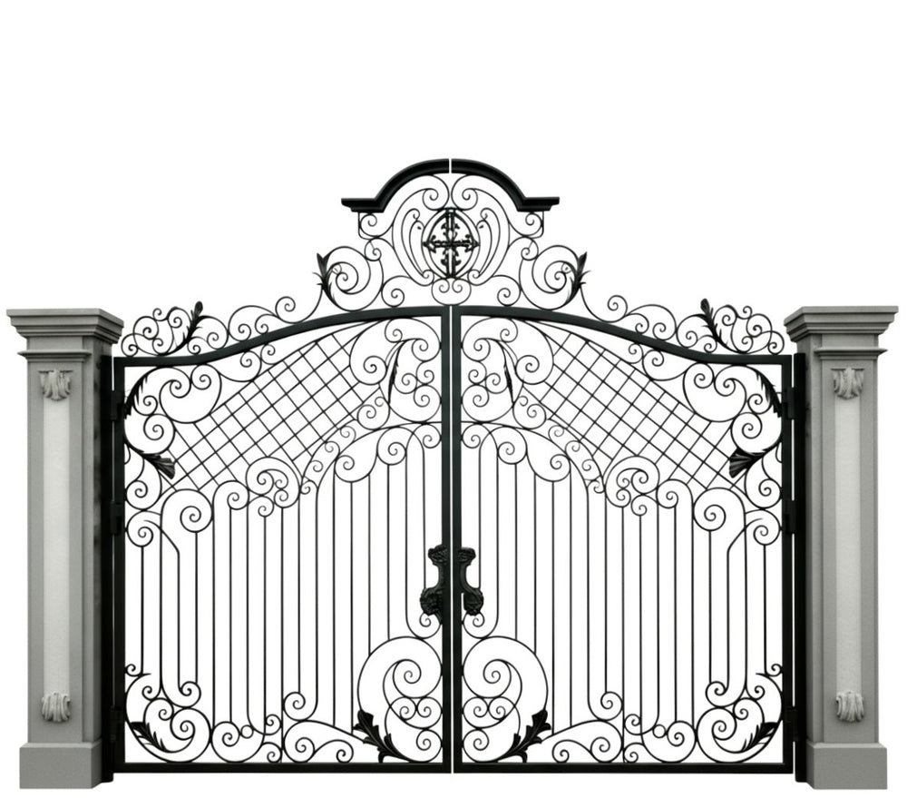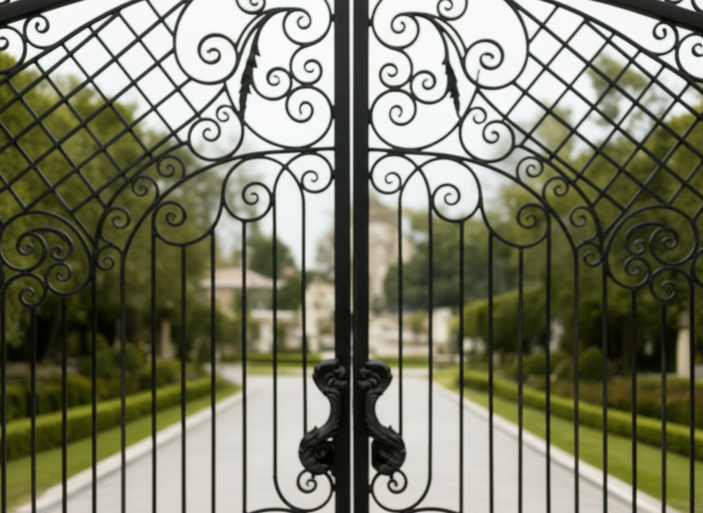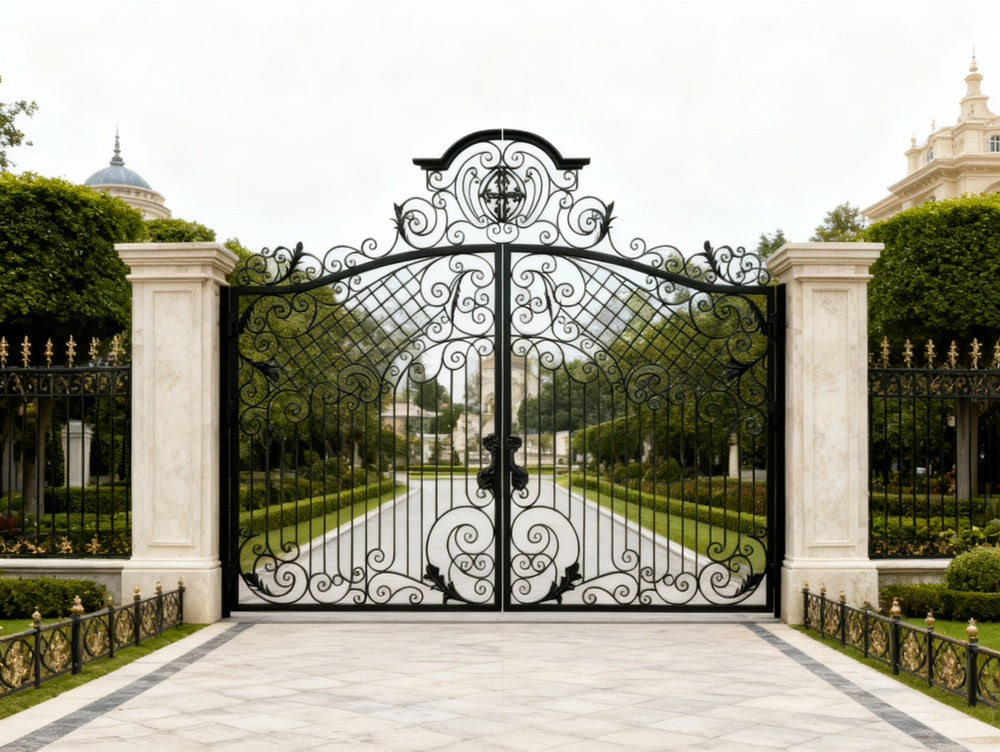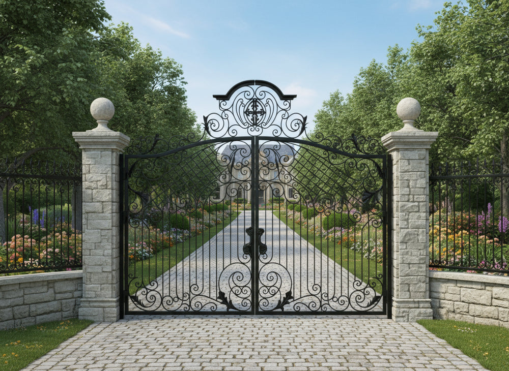A gate that guards with grace. Crest veil Manor features dual swing panels adorned with swirling scrollwork and lattice detailing, converging at a central crest emblem that anchors the design in legacy and elegance. The arched top adds architectural lift, while the flanking stone pillars—each topped with sculpted urns—frame the entrance in classical grandeur. This gate evokes strength, refinement, and timeless craftsmanship.