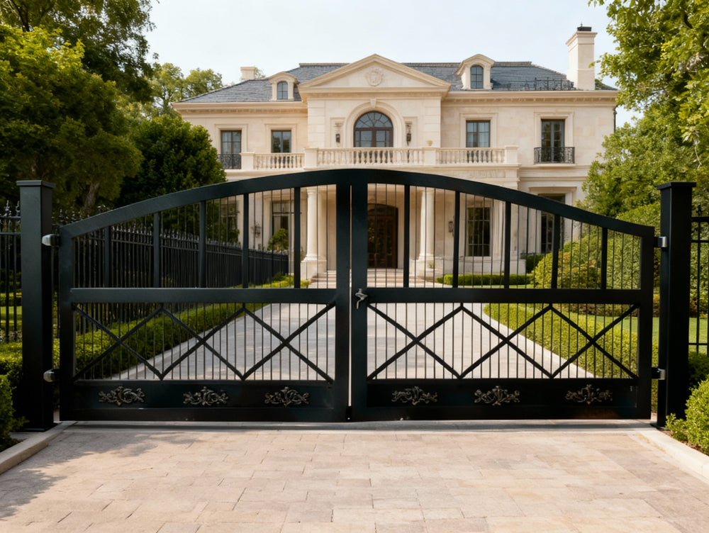 crisscross wrought iron gate, arched driveway gate, vertical bar estate gate, Canadian custom gate, Taimco decorative gate, minimalist property gate, heavy-duty metal gate design