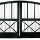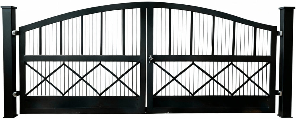 A gate that balances form and function. Crossbar Arcadia features dual swing panels with vertical bars in the upper section and decorative crisscross latticework below. The gentle arch adds architectural lift, while the central latch and symmetrical layout ensure secure closure and visual harmony. Supported by sturdy posts, this gate evokes strength, simplicity, and timeless design.