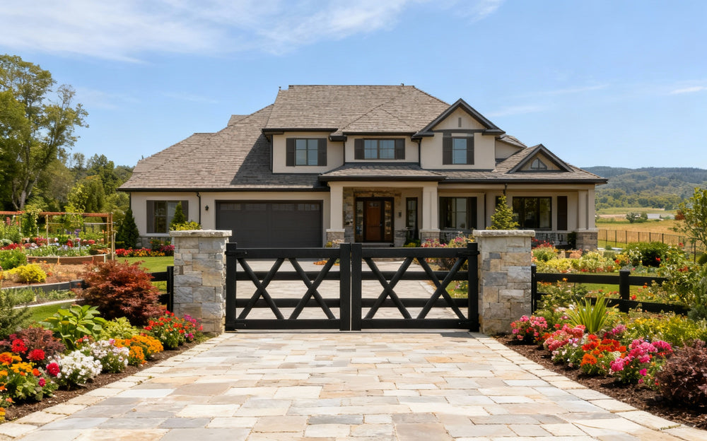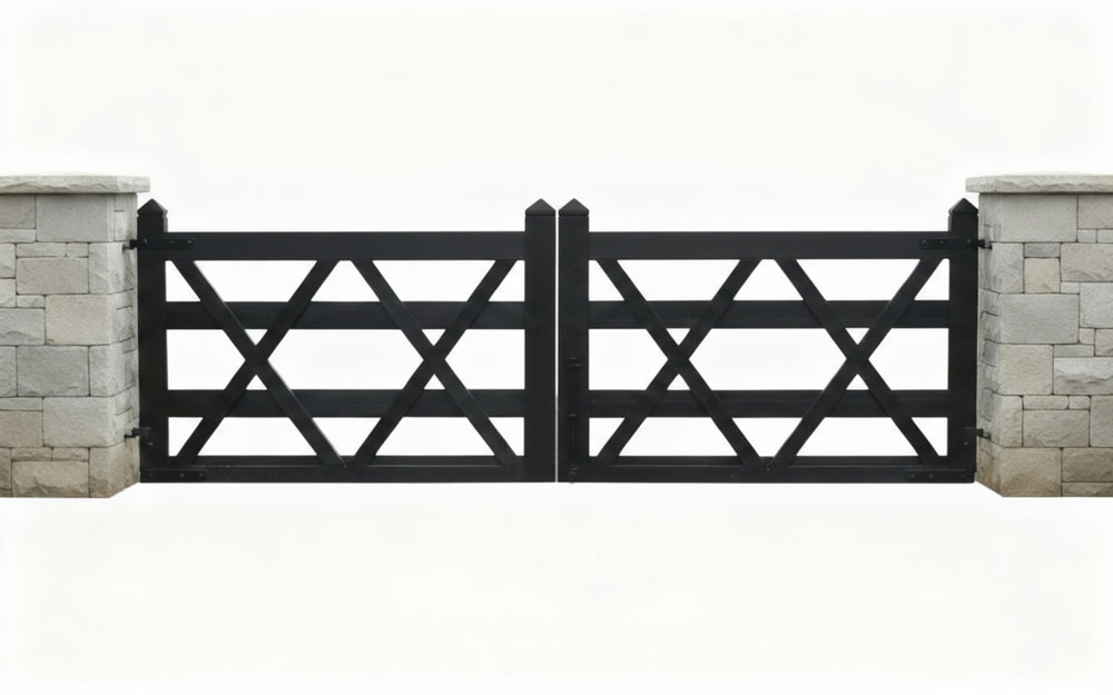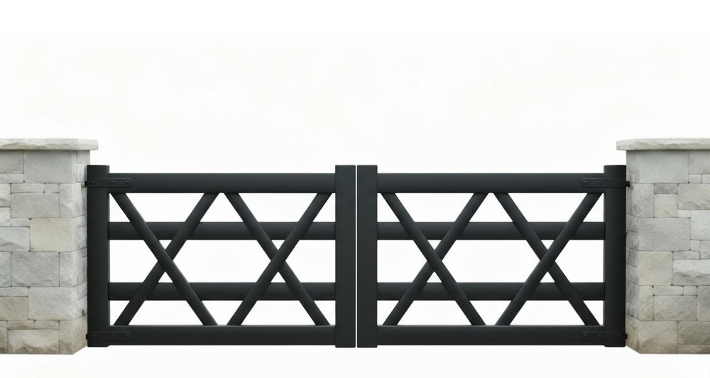 A gate that speaks in lines and angles. Crossbar Sentinel features dual swing panels with diagonal “X” patterns framed by horizontal bars at the top, middle, and base. The design delivers both visual rhythm and structural integrity, while the light-toned stone pillars offer a grounded contrast to the sleek black steel. Perfect for properties that value clean geometry, security, and architectural cohesion.
