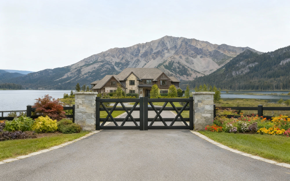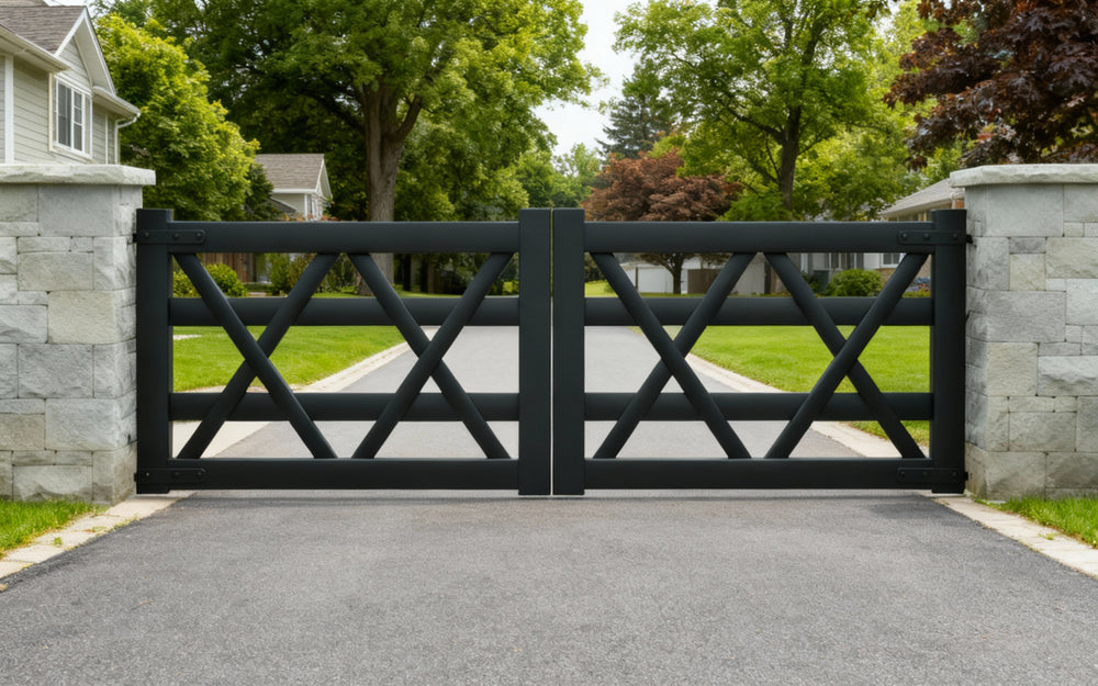Crisscross driveway gate, X-pattern steel gate, modern residential entrance, Canadian custom gate, Taimco geometric gate, heavy-duty estate gate, swing gate with diagonal bars, matte black steel gate