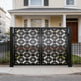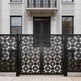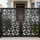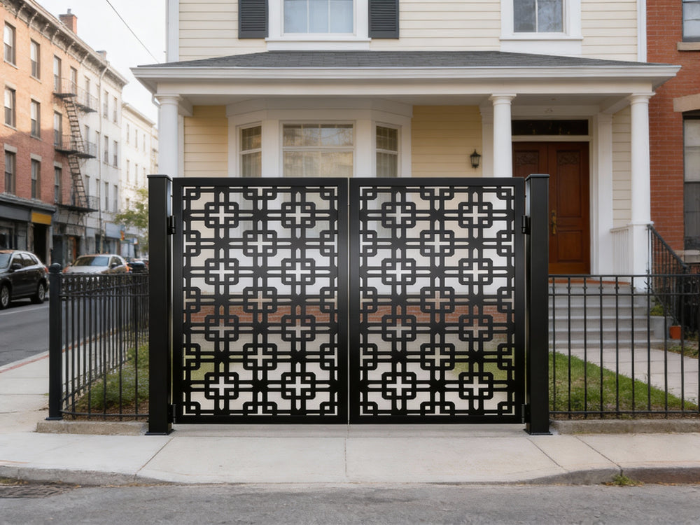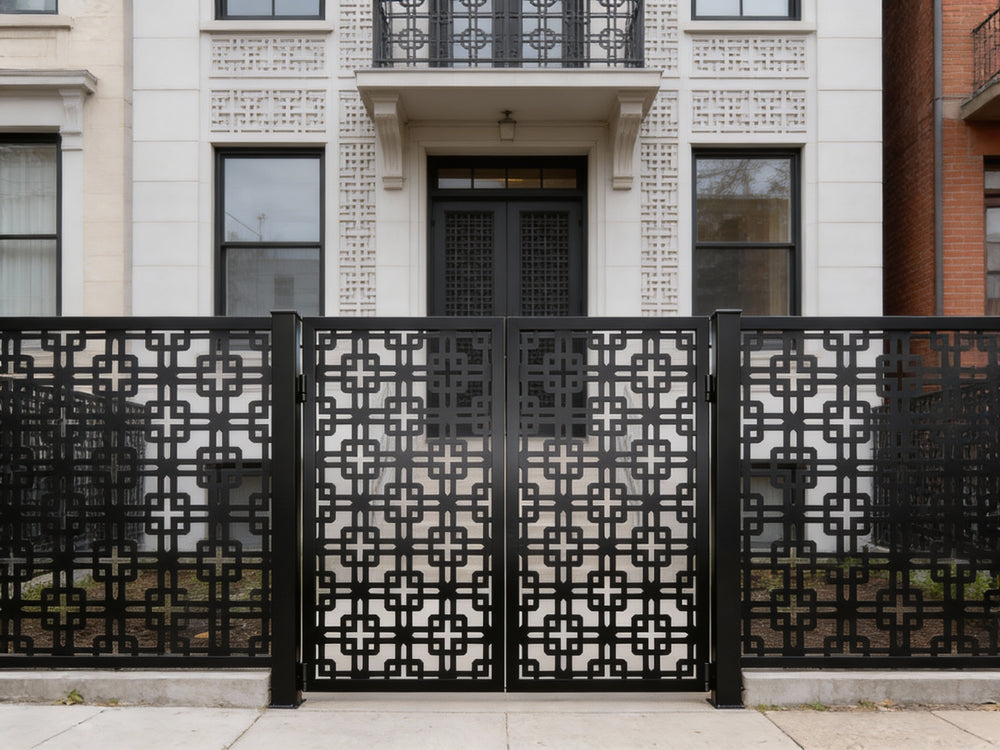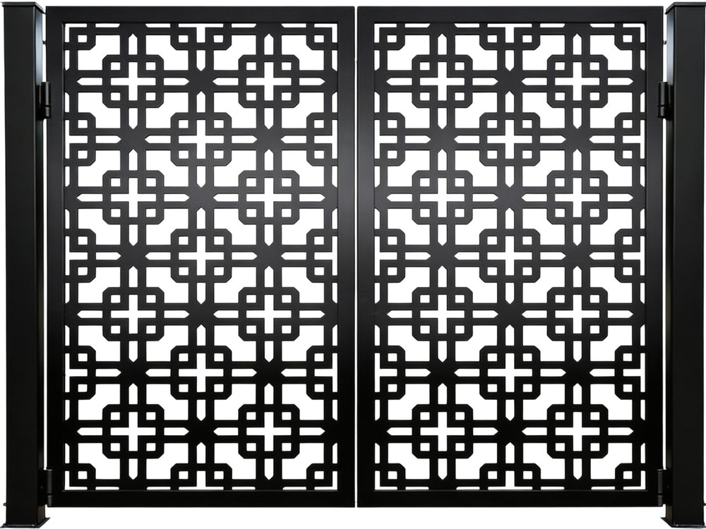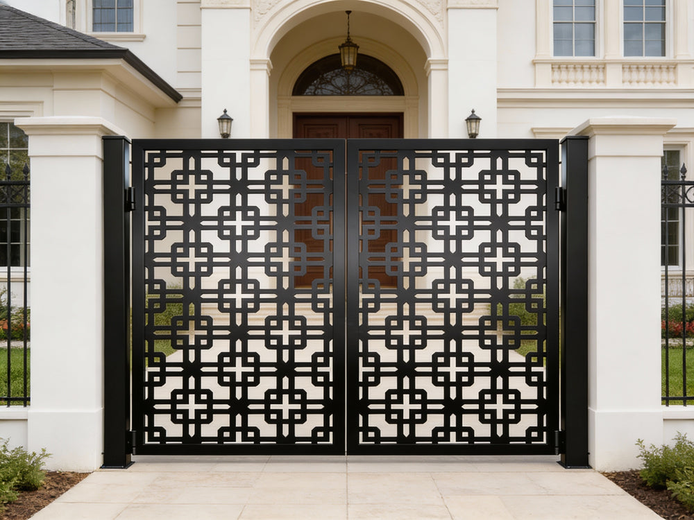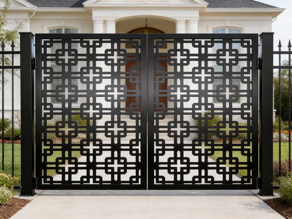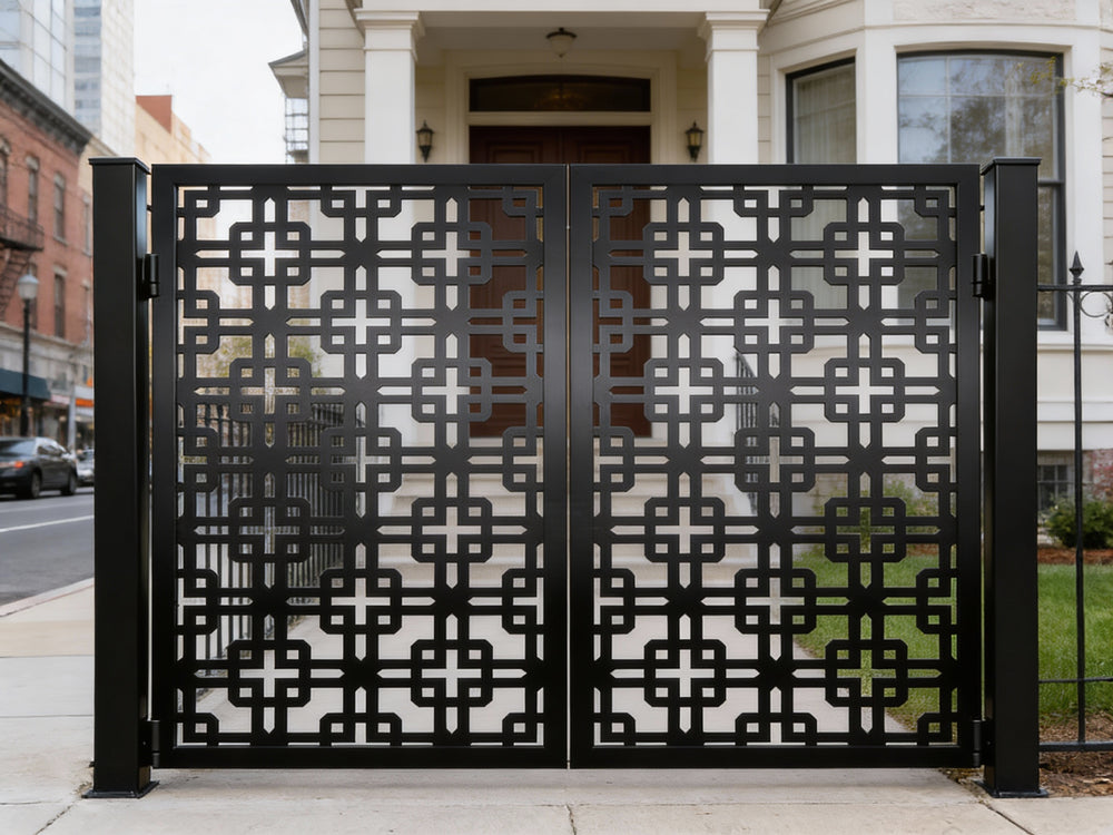 A door that speaks in symmetry and structure. Crossveil Passage features two mirrored panels adorned with a repeating lattice of interlocking squares and cross motifs. The design offers a bold geometric rhythm, enhanced by a clean arched top and crisp matte black finish. Ideal for garden entries, architectural transitions, or residential walkways, this man door blends ornamental precision with secure craftsmanship.