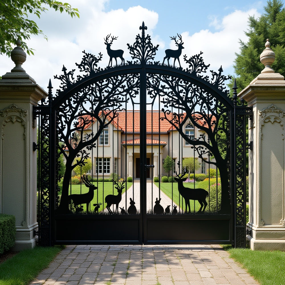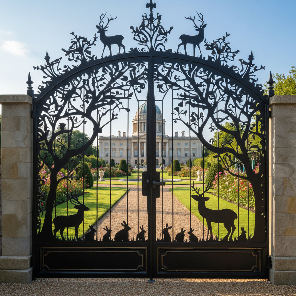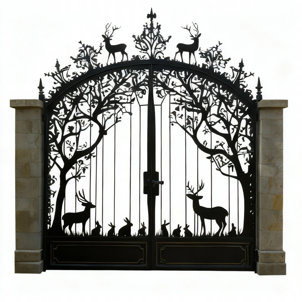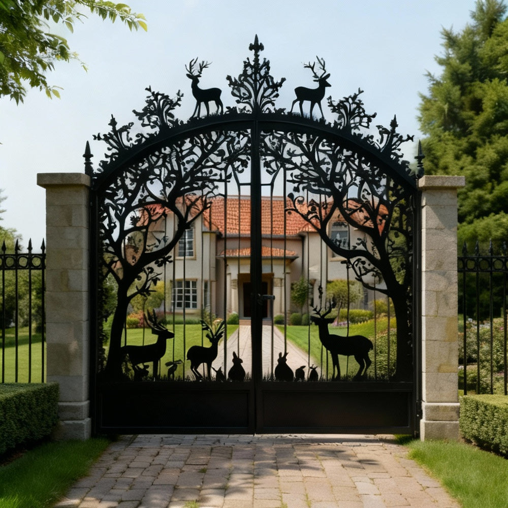 Let your entrance speak in silhouettes. Crown wood Preserve features a majestic tree arch crowned with deer, while the lower panels depict a serene woodland scene with rabbits, birds, and grazing wildlife. Every branch, leaf, and creature is plasma-cut with precision and layered for depth, creating a gate that feels alive with movement and meaning. Perfect for estates that honor nature, storytelling, and timeless craftsmanship.