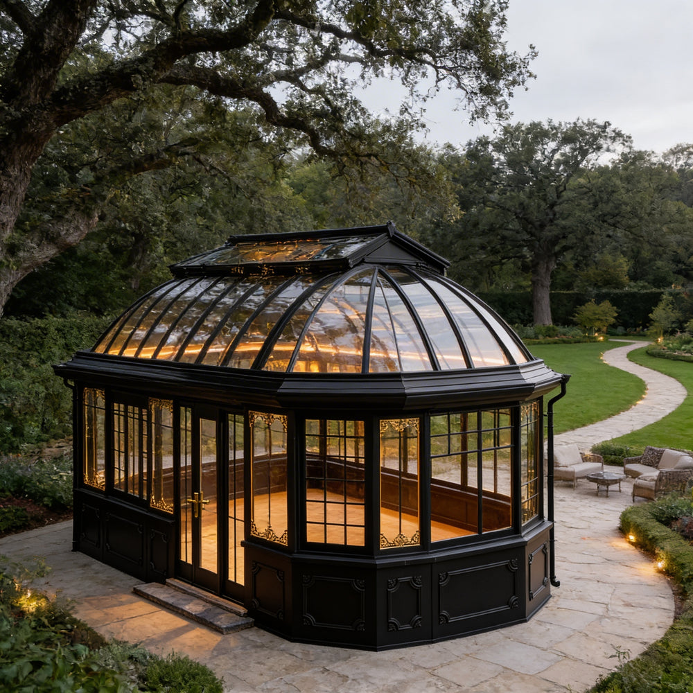 attached conservatory, curved glass sunroom, wrought iron sunroom extension, luxury home conservatory, tempered glass roof sunroom, custom metal conservatory, architectural home extension, garden view sunroom, premium glass pavilion, luxury outdoor room, steel frame conservatory, curved roof greenhouse, attached glass pavilion, custom residential sunroom, wrought iron glass extension.