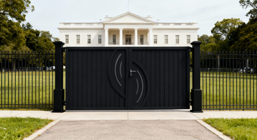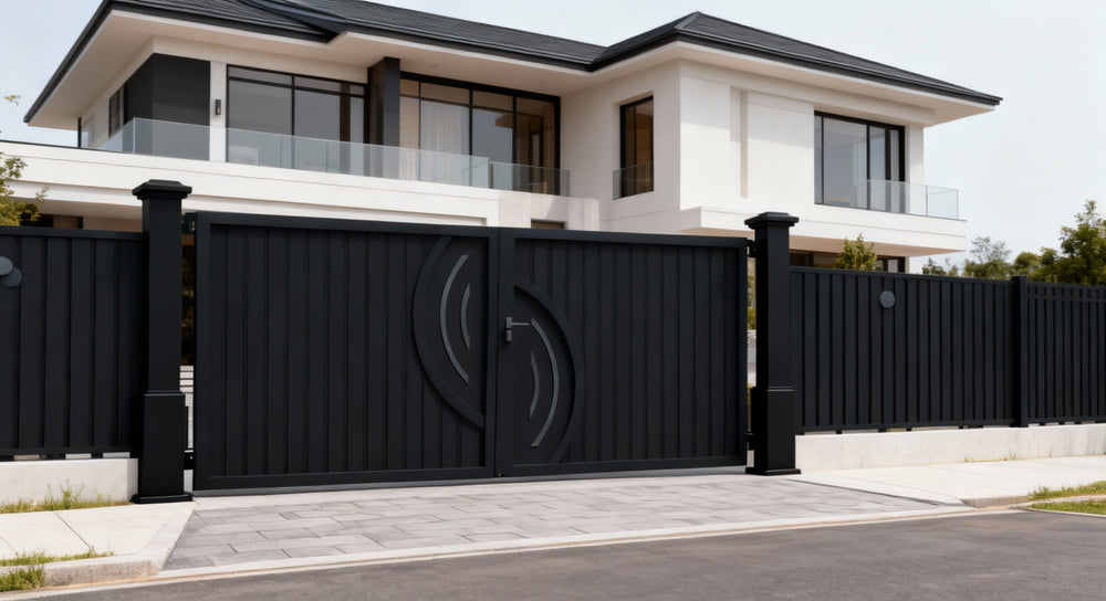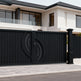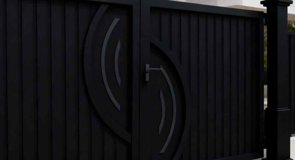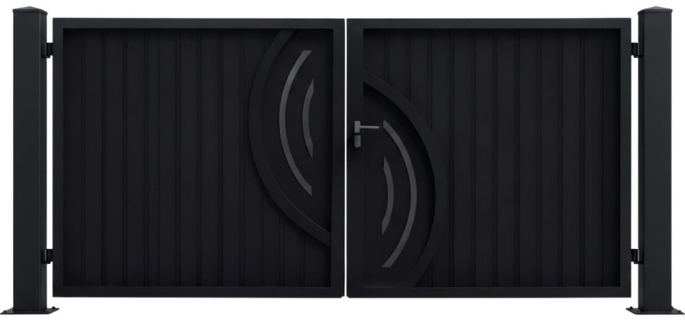 A gate that speaks in quiet geometry. Curveframe Axis features dual swing panels with vertical slats and a mirrored curved overlay that forms a subtle central arc. The matte black finish enhances its architectural presence, while the minimalist design offers privacy without visual clutter. This gate evokes precision, elegance, and modern restraint—perfect for urban estates, design-forward homes, or commercial entries.