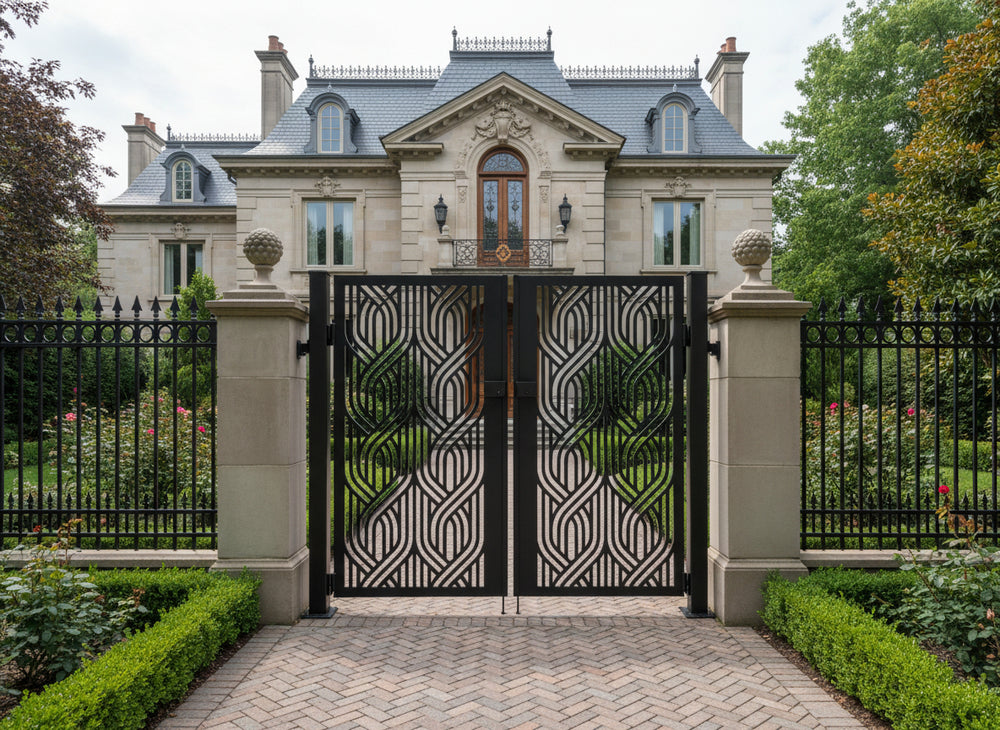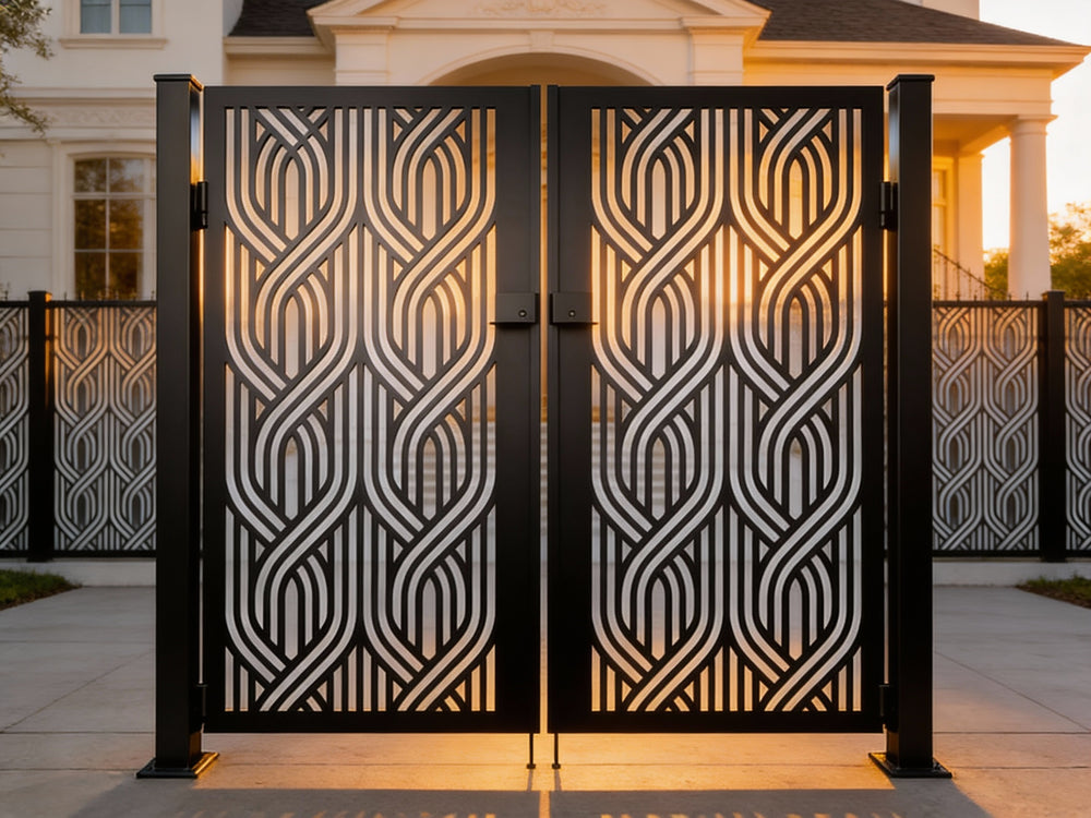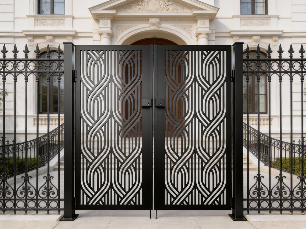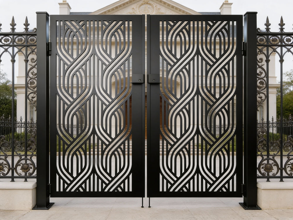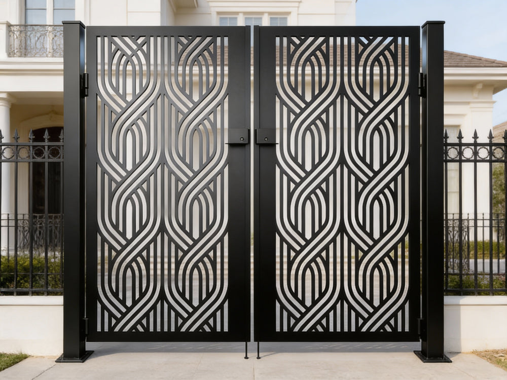 A door that flows with sculptural precision. Curvex Passage features two symmetrical panels framed in matte black, each showcasing a pattern of interwoven curved lines that ripple across the surface in mirrored harmony. The laser-cut design offers partial visibility and airflow while delivering bold visual impact. Ideal for garden entries, residential walkways, or modern transitions, this man door blends fluid geometry with secure craftsmanship.
