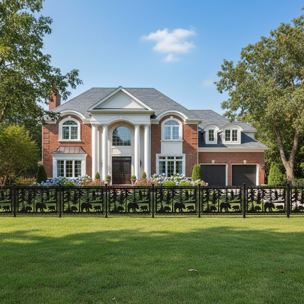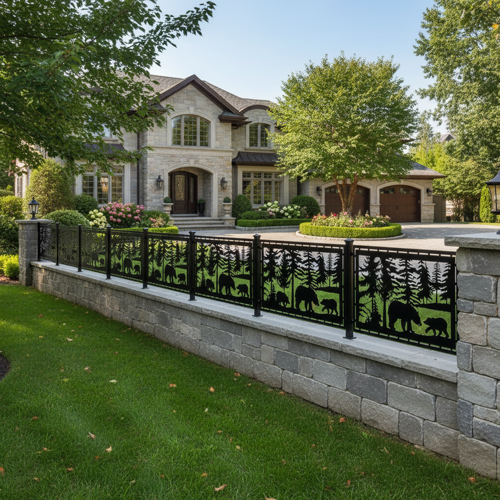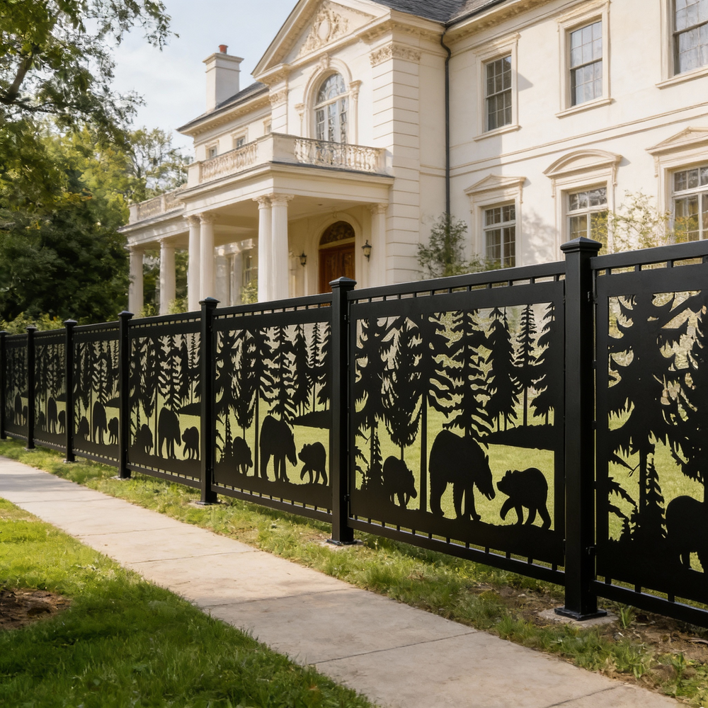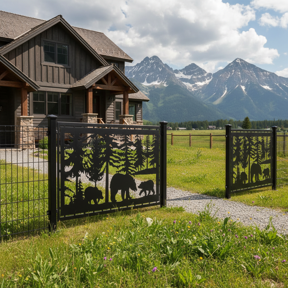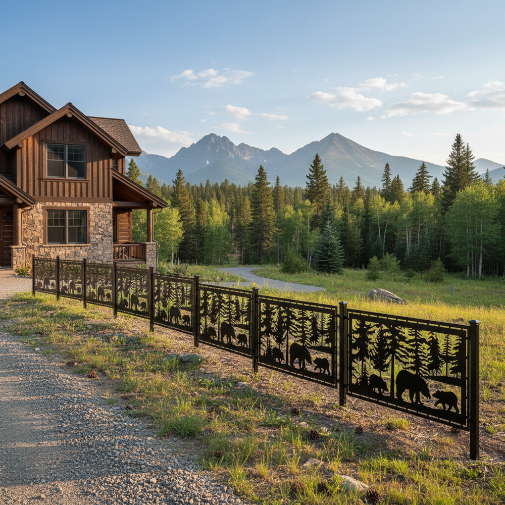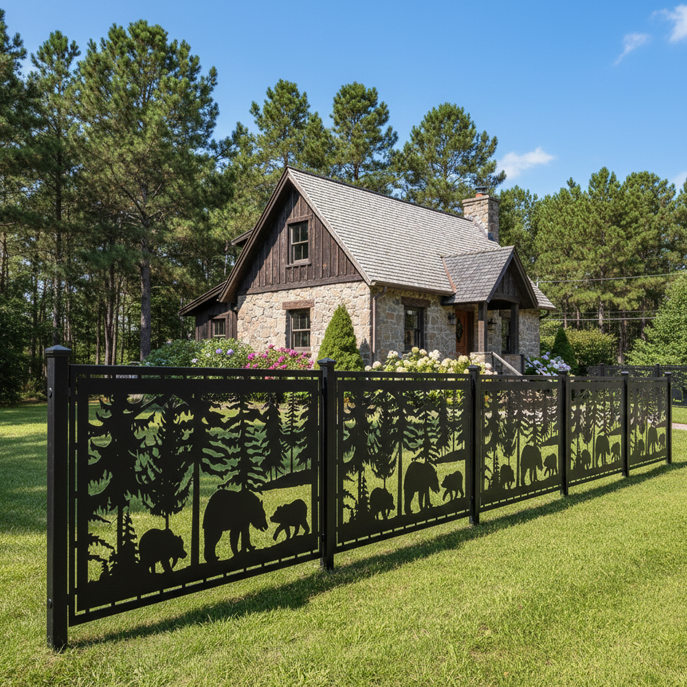 Bear Forest Scene Plasma‑Cut Steel Fence Panel | Rustic Wildlife Metal Privacy Screen Model # LFP945