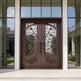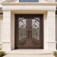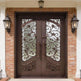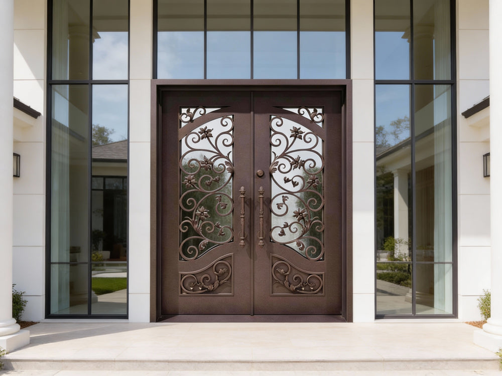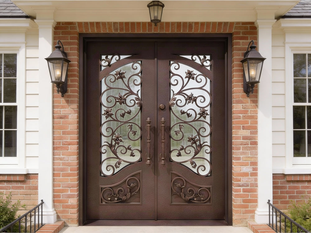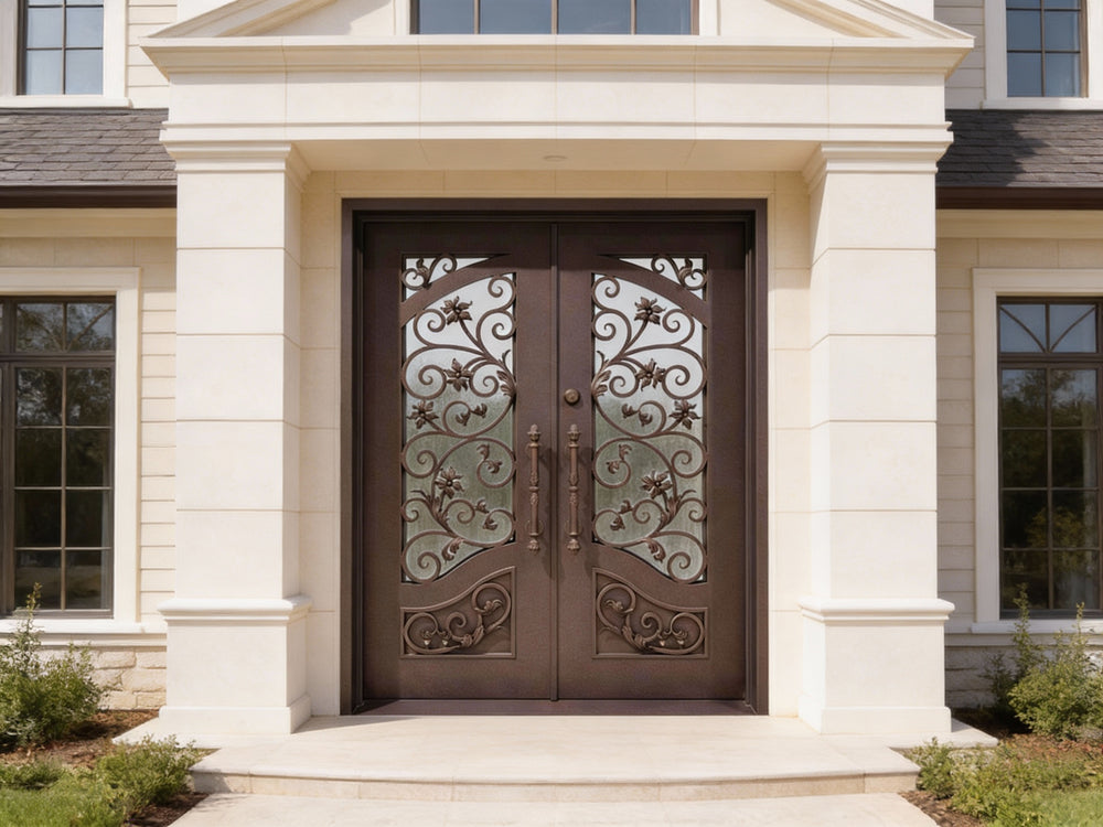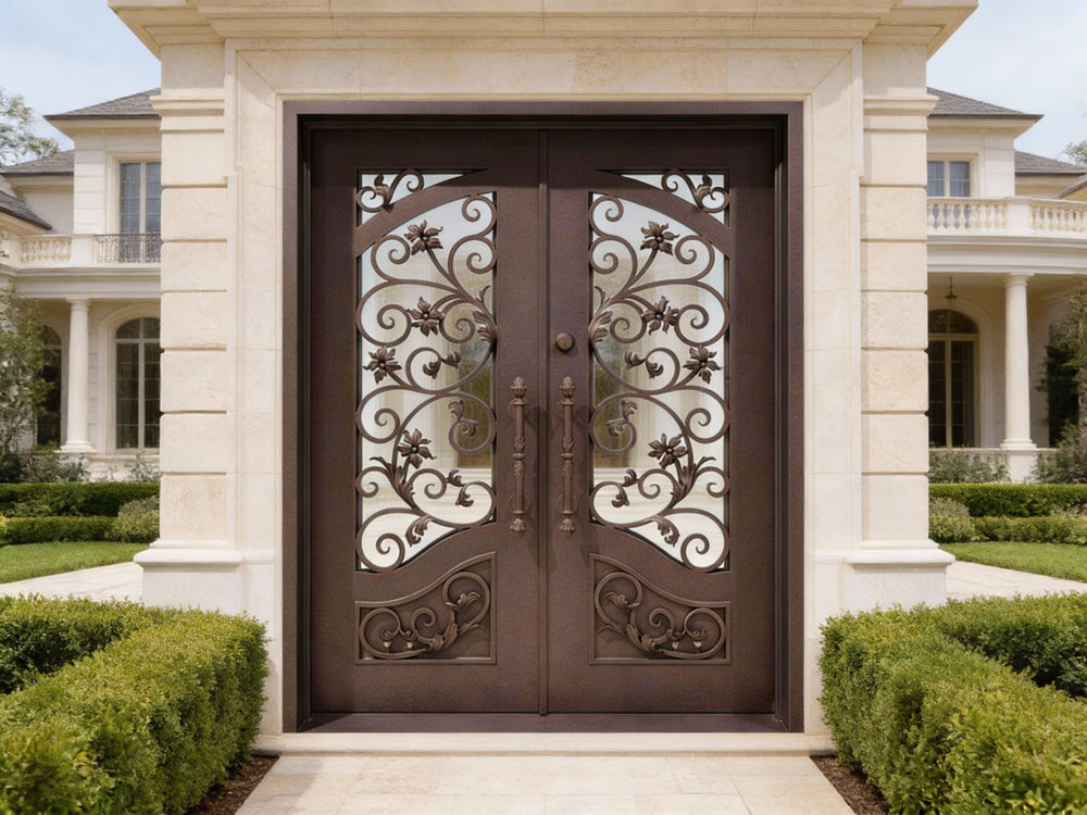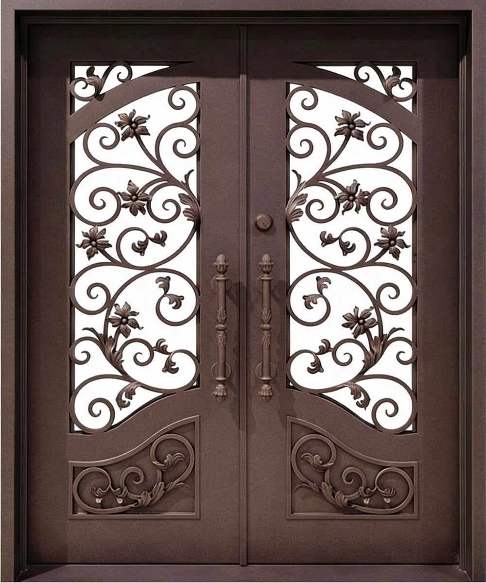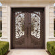 wrought iron double entry doors floral scrollwork iron doors black metal exterior doors custom decorative iron doors Canada ornate front door with glass powder-coated steel doors symmetrical scroll iron doors Taimco Model IWD1061 premium wrought iron entrance entry doors with pull handles