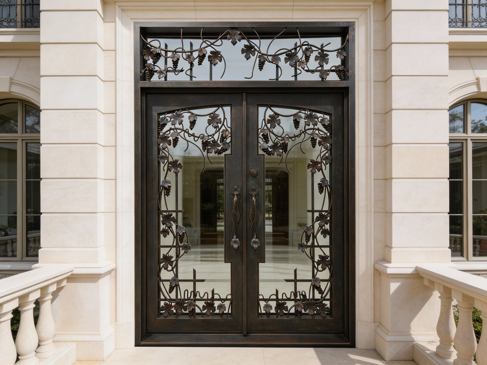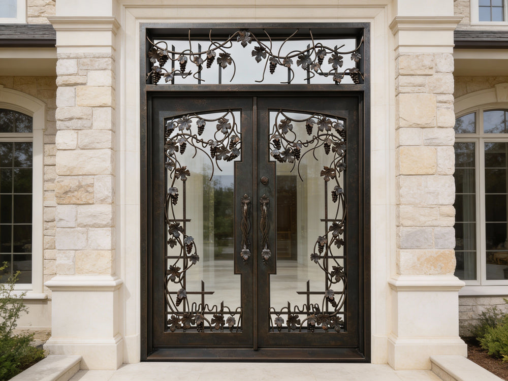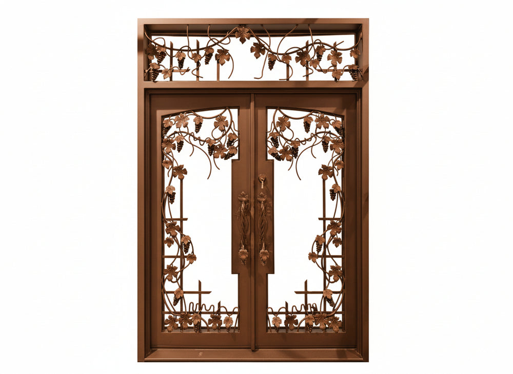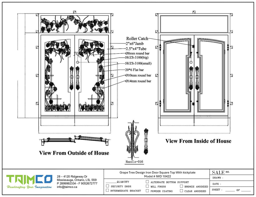 Grape vine iron door, Ornamental wrought iron entry door, Square top iron door with kickplate, Decorative iron front door, TAIMCO iron door IWD10422, Grape tree design wrought iron door, Custom iron door with grapevine scrollwork, Powder-coated wrought iron entry door, Artistic metal door with square top, Handcrafted iron door with kickplate, Luxury iron door Canada, Exterior wrought iron door with design, Galvanized steel entry door, Customizable iron door for home, Elegant iron door with nature motif