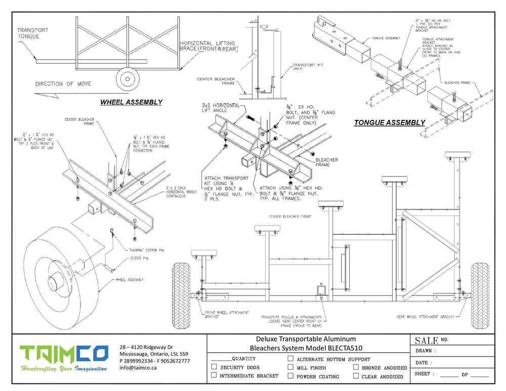 To relocate these transportable bleachers, a separate Transport Kit (sold independently) is required. The kit includes a jack for lifting the system, the wheel assembly with an attached axle, the tongue assembly, and removable brackets to secure the tongue assembly.