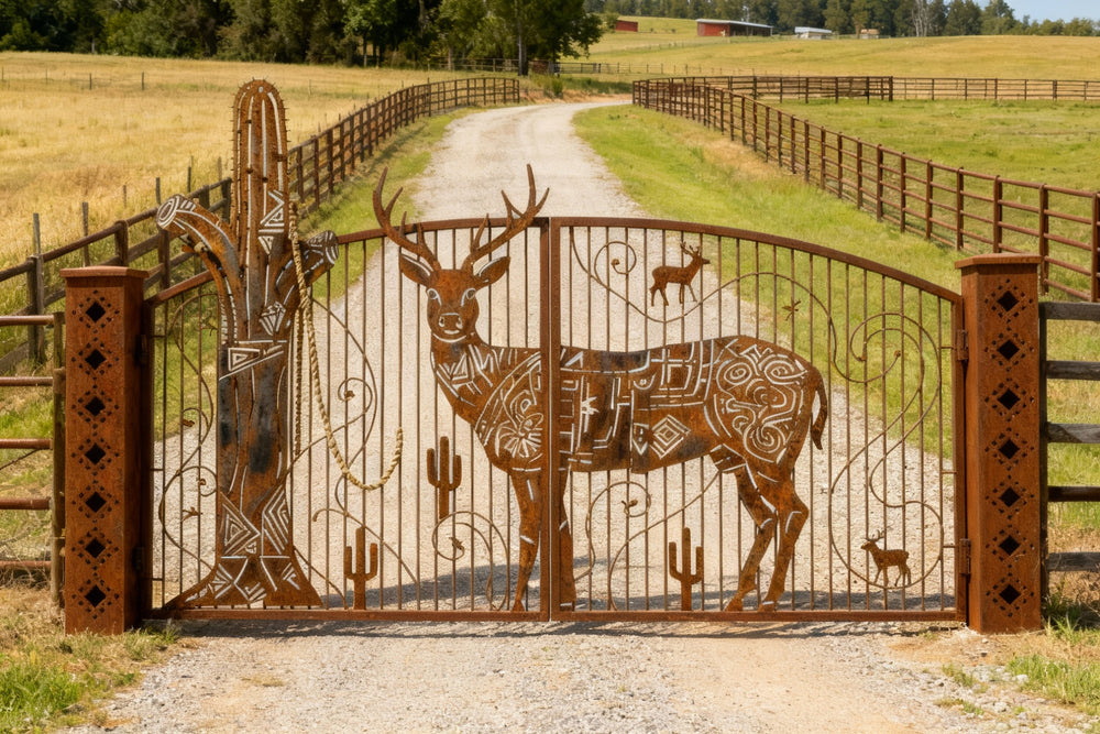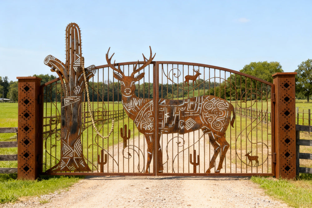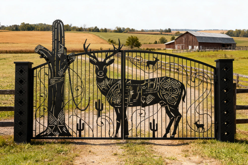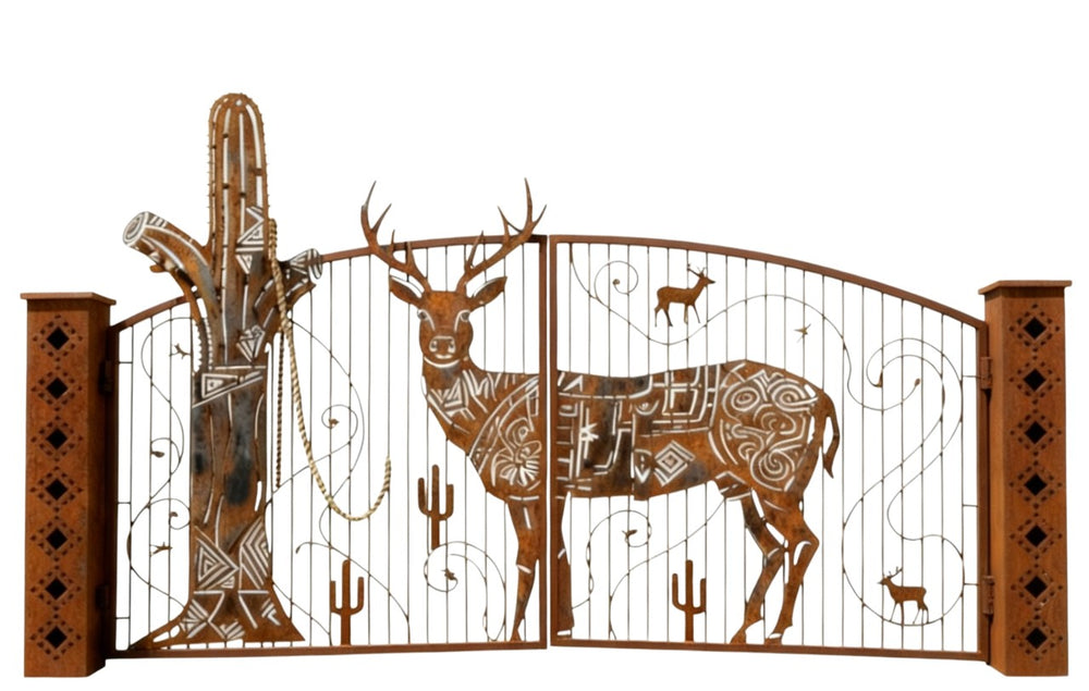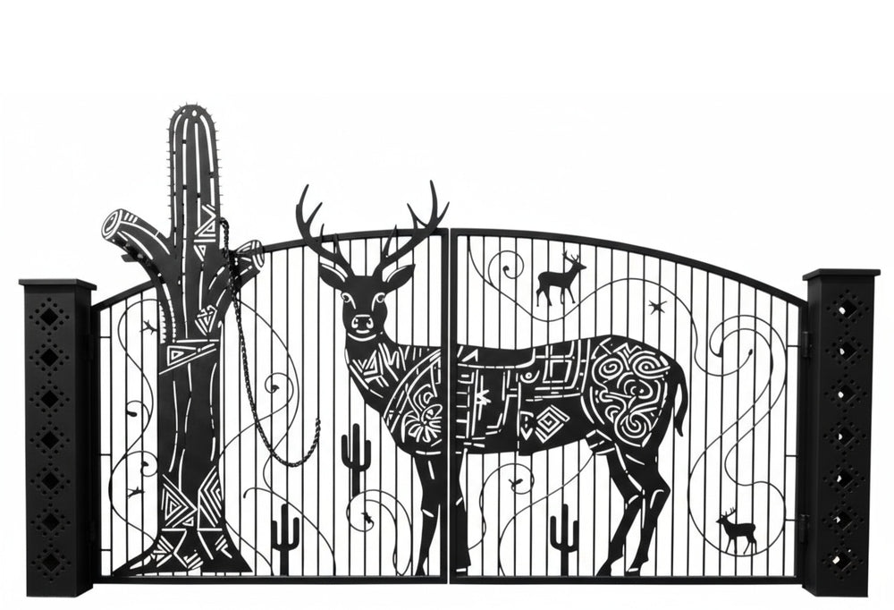 A gate that watches with wisdom. Desert Sentinel features dual swing panels centered around a stylized deer, its body etched with geometric patterns that evoke tribal art and natural symmetry. Flanked by tall cacti and swirling vine motifs, the design includes stars, smaller deer figures, and abstract flourishes that create a visual narrative. The gate is framed by black pillars with diamond cutouts, grounding the composition in bold contrast and modern edge.