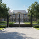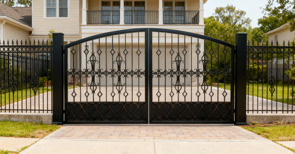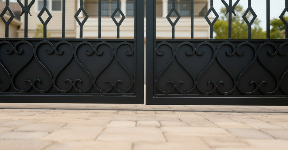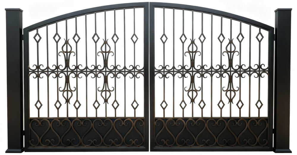 A gate that speaks in patterns. Diamond scroll Manor features dual swing panels adorned with vertical bars, diamond-shaped accents, and ornamental scrollwork. The lower section anchors the design with repeating heartline motifs, while the arched top adds architectural lift. Framed by solid posts, this gate evokes refinement, structure, and timeless grace—perfect for driveways, courtyards, or formal estate entrances.