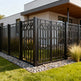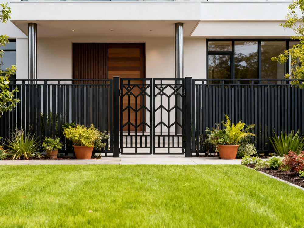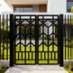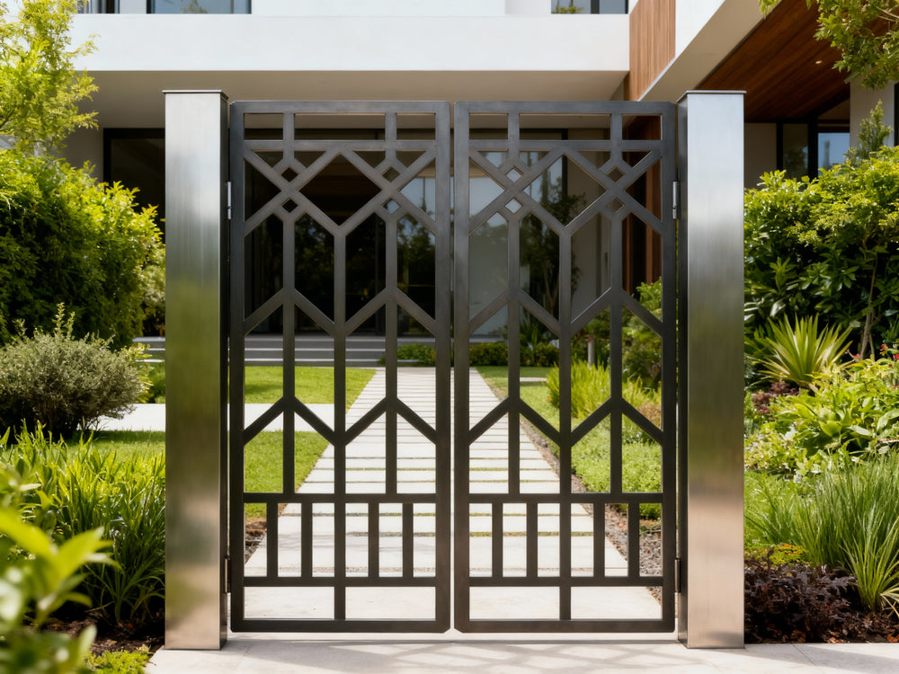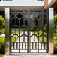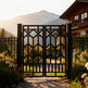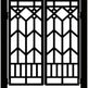 A door that sharpens symmetry. Diamonveil Passage features two mirrored panels with interlocking diamond motifs at the top and chevron-style diagonal latticework below. The lower section is framed by vertical bars within rectangular borders, offering both visual weight and structural rhythm. Ideal for estate entries, architectural transitions, or decorative boundaries that blend geometric precision with ornamental strength.