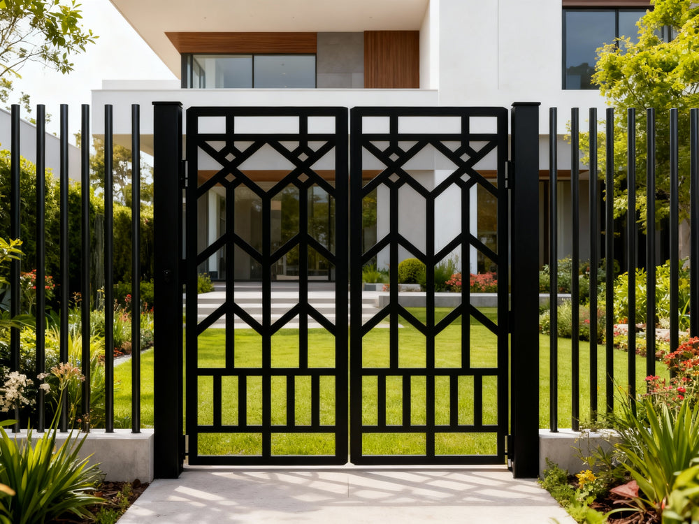 diamond lattice man door, chevron grid metal gate, geometric wrought iron garden entry, Canadian custom gate, Taimco architectural passage door, manual operation estate gate