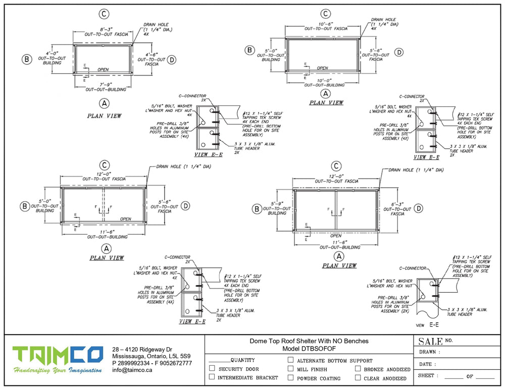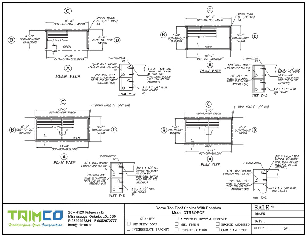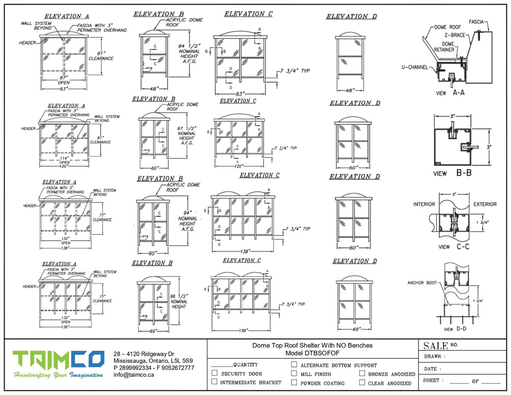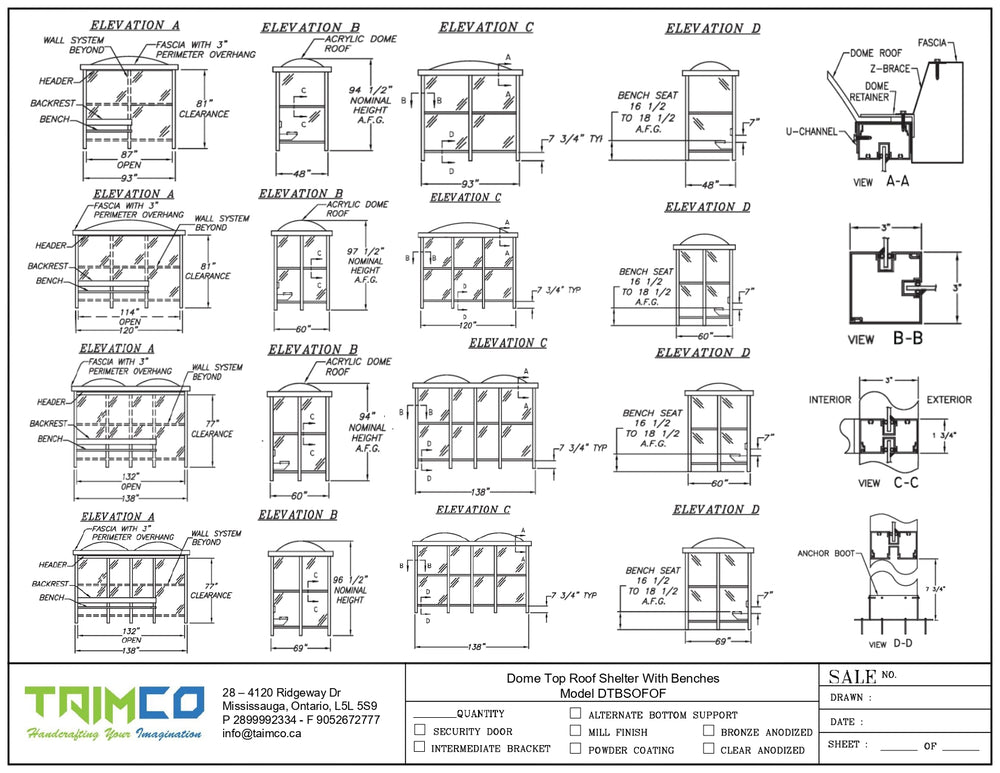 The Dome Top Roof Bus Stop Shelter Model DTBSOFOF is a modular, prefabricated shelter designed to provide protection and comfort for passengers at bus stops, shuttle depots, railway stations, and similar locations. Built with high-quality aluminum framing and tempered safety glass, it ensures durability, safety, and longevity in all weather conditions. The open front design allows easy access while maintaining a sheltered waiting area.
