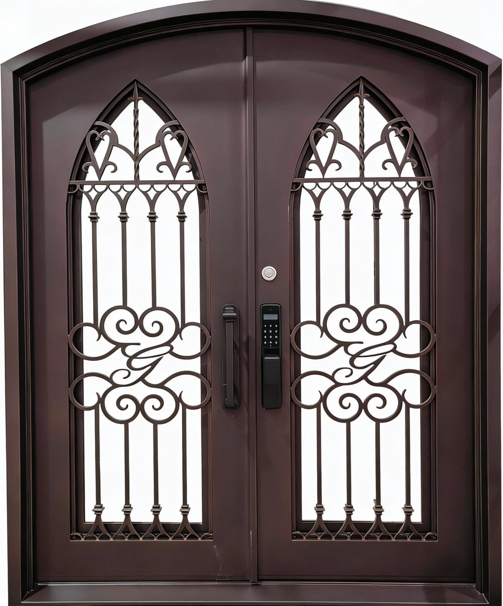 Welcome guests with bold elegance IWD1054 double iron doors feature Gothic-style arched panels adorned with custom “G” monogram scrollwork for a distinguished architectural touch. Crafted from powder-coated galvanized steel and fitted with operable double pane glass, this piece balances ornamental detail with durable construction to elevate any luxury façade.