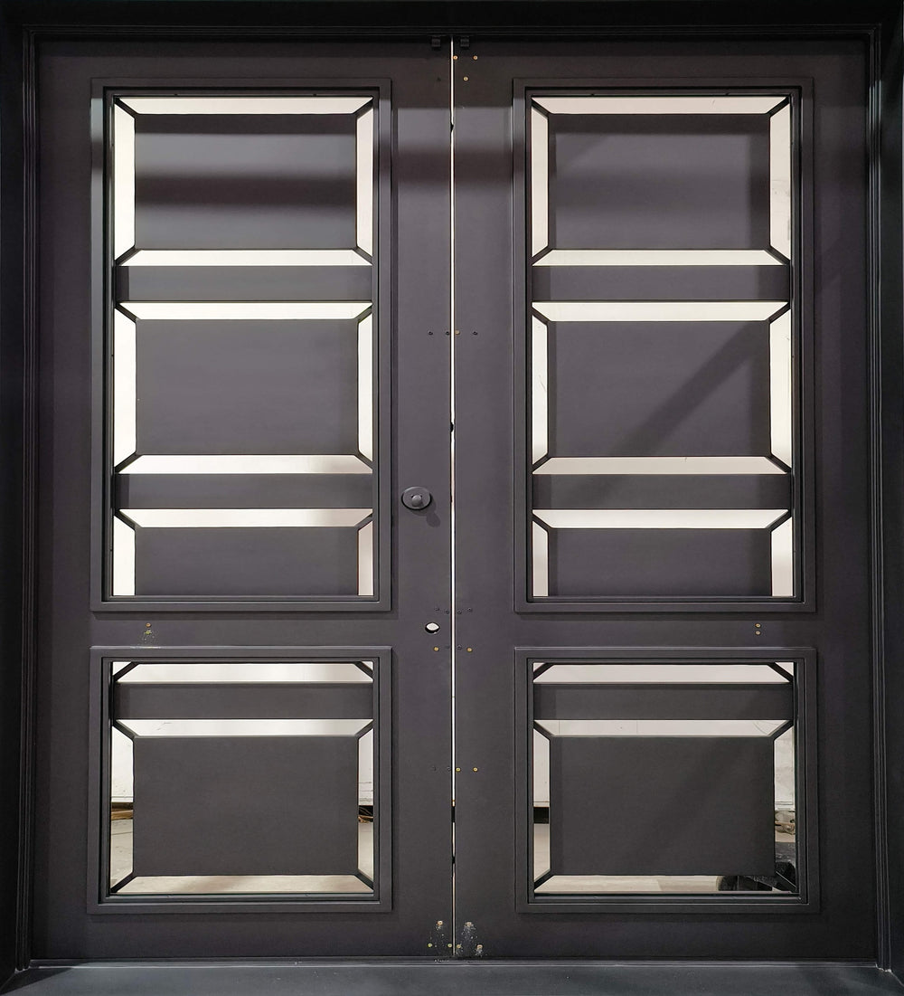 double steel entry door, geometric panel iron door, metallic trim steel door, modern black iron front door, custom steel door Canada, architectural dual iron door, high-security double door, designer black steel entrance, urban style steel door, premium welded metal door.