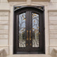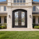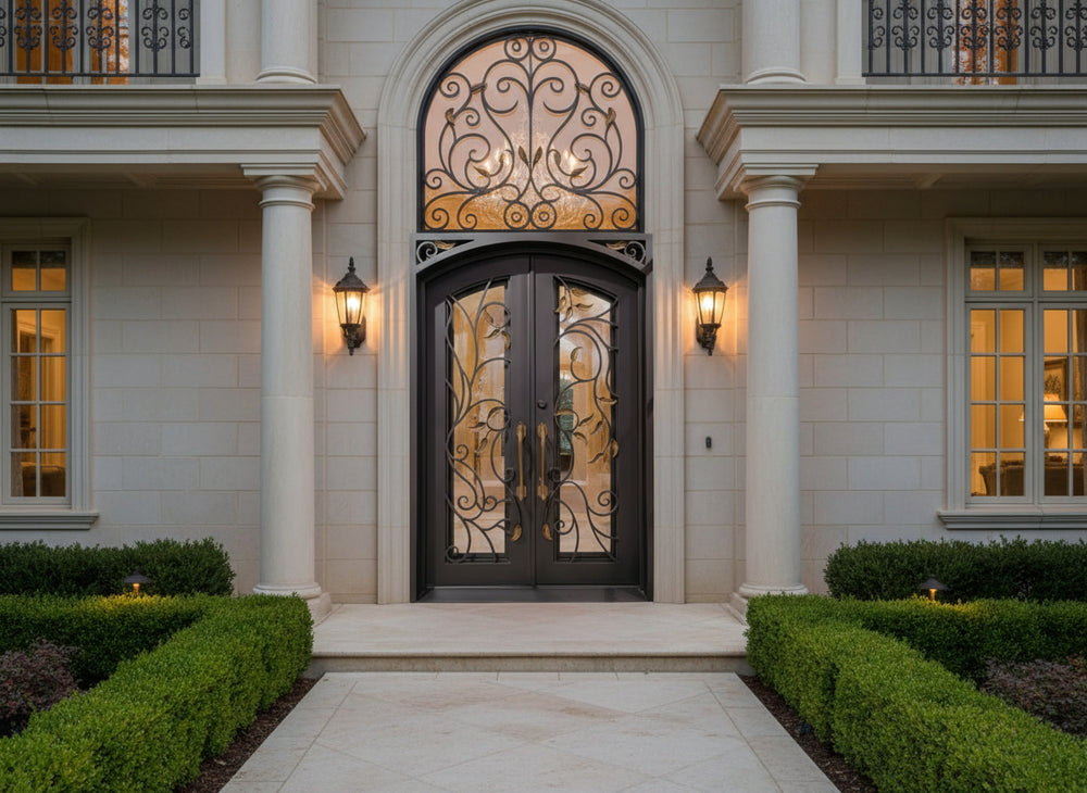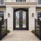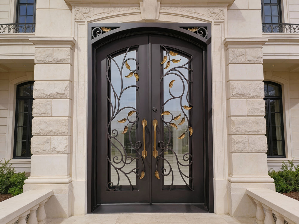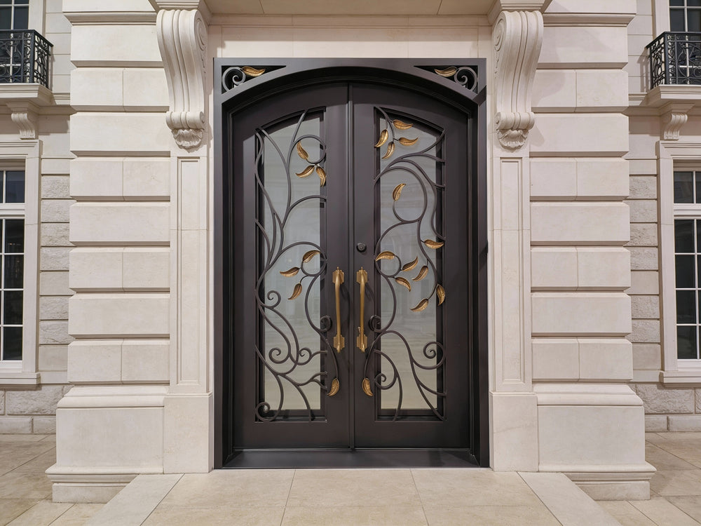 Double Wrought Iron Entry Doors – Black & Gold Leaf Scrollwork with Arched Frame | Model IWD1059