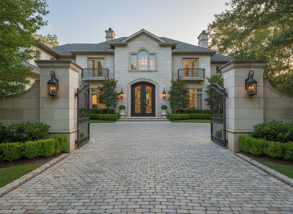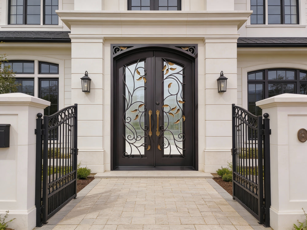 Make an unforgettable first impression with the IWD1059 double iron doors by Taimco. This premium entryway features hand-forged scrollwork with golden leaf details, set against a black powder-coated steel backdrop. Accented with matching gold handles and an arched frame, this design exudes elegance, strength, and timeless European charm. Engineered for durability and visual impact, it brings artistry and security to any upscale home façade.