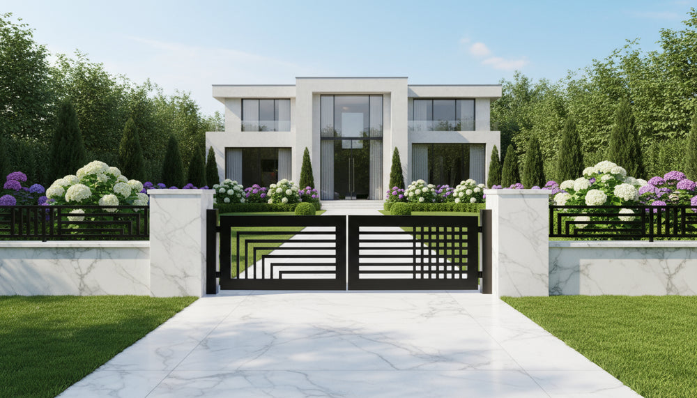 split-pattern driveway gate, geometric steel gate, modern and classical gate design, Canadian custom gate, Taimco architectural gate, marble column entrance, heavy-duty artistic gate, dual-panel estate gate