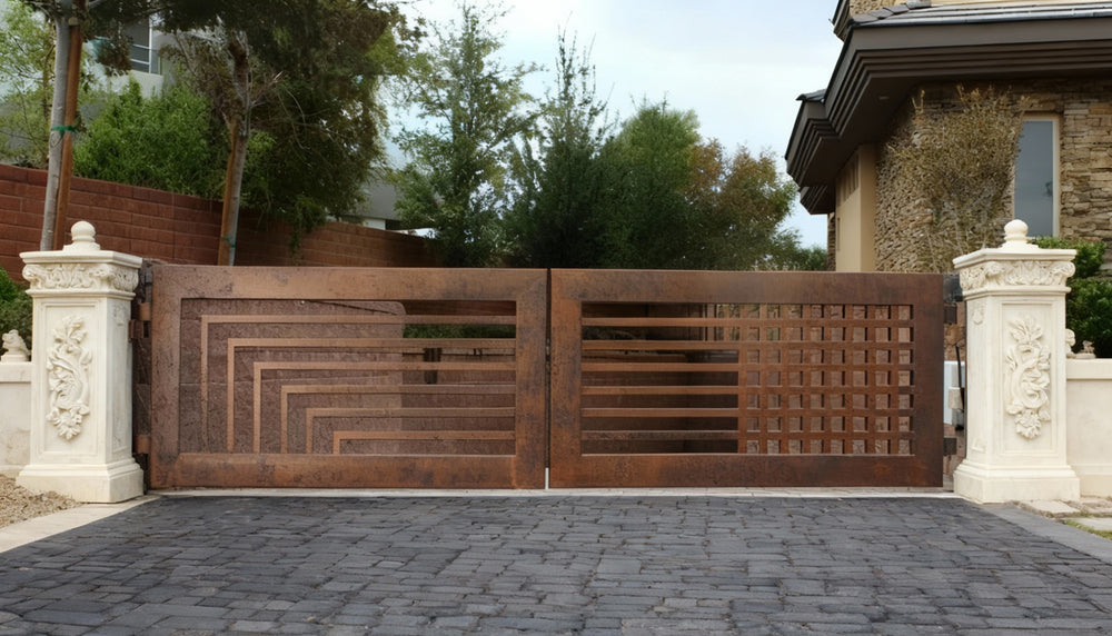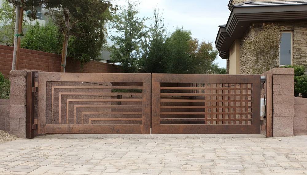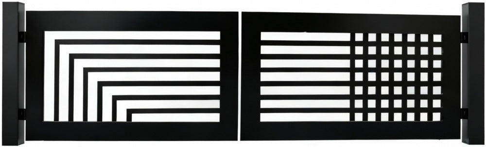 Dual Form Axis – Split-Pattern Geometric & Grid Steel Driveway Gate Model # DWG1011
