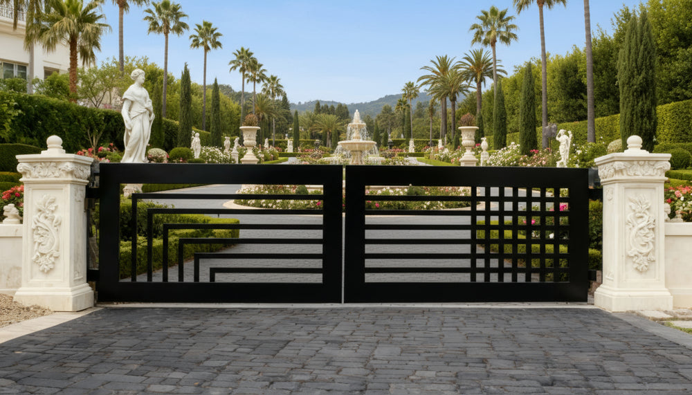 A gate that speaks in opposites. DualForm Axis features two distinct yet harmonized panels: the left side showcases nested right angles forming a cascading L-shape motif, while the right side presents a clean grid of rectangular openings. Framed by marble columns topped with sculpted globes and lanterns, this gate blends classical ornamentation with modern geometry—perfect for properties that embrace architectural duality and visual intrigue.