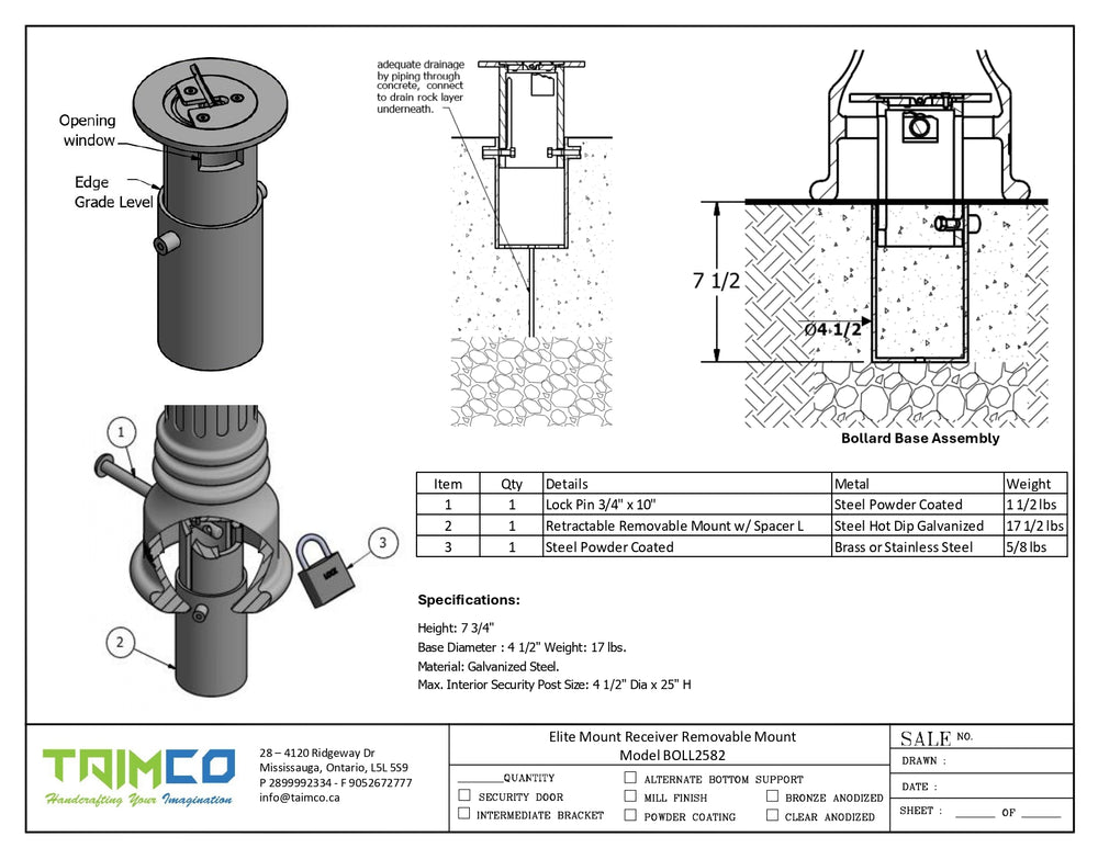 Many of TAIMCO’s decorative bollards can be installed with removable mountings. Premium Removable Mounts feature a retractable mounting column that sits flush in the ground when bollards are removed. Premium receivers are made from galvanized steel to prevent oxidation with long-term use.