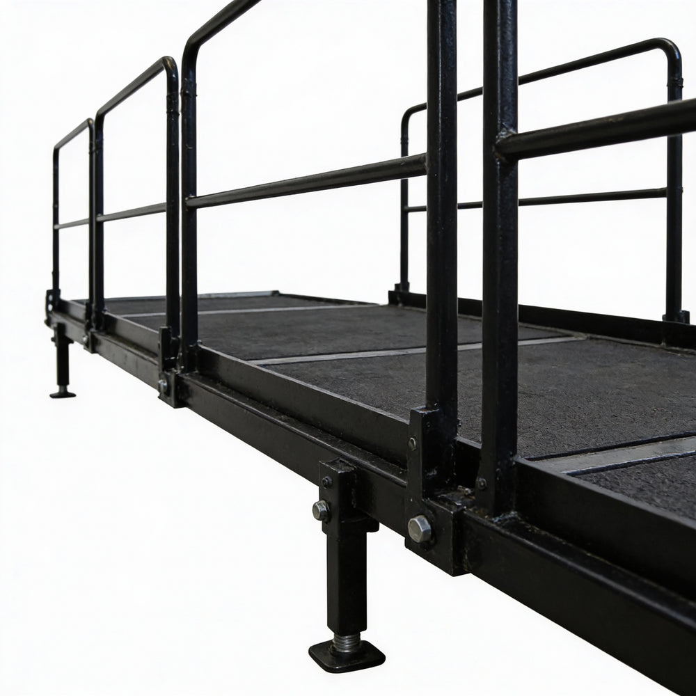 Enhance your stage setup with the TAIMCO Freestanding Equipment Ramp, designed for 12", 24" AND 36" high stages. This 4-foot wide ramp features a 1:12 slope and horizontal guard rails, ensuring safe and easy equipment transport. Compatible with both ST8100 and AS2100 stage systems (adaptor bracket required for AS2100).