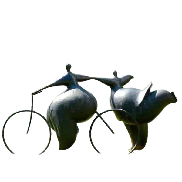 Capture the essence of movement and joy with our unique outdoor sculpture featuring two abstract figures riding bicycles. This artwork, with its smooth, flowing lines and exaggerated, rounded body shapes, brings a sense of dynamism and freedom to any space. Perfect for parks, gardens, and public spaces, this sculpture is a striking addition that evokes a playful and energetic atmosphere.”