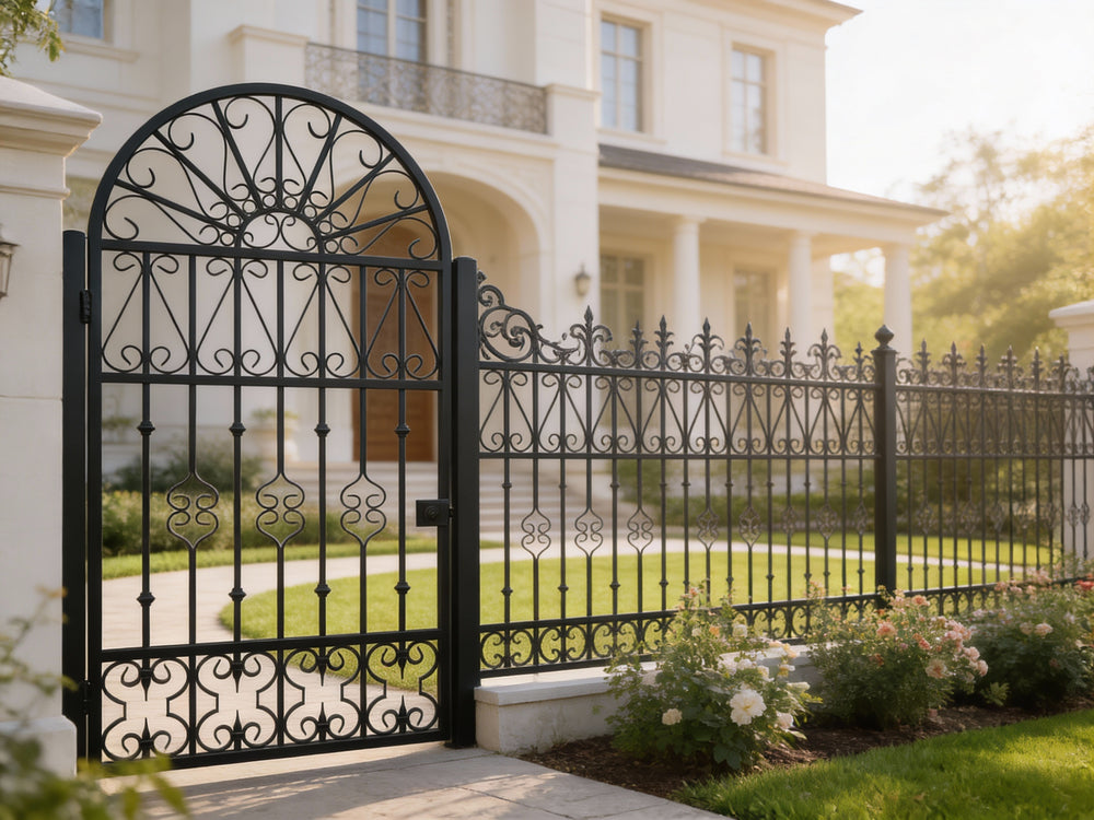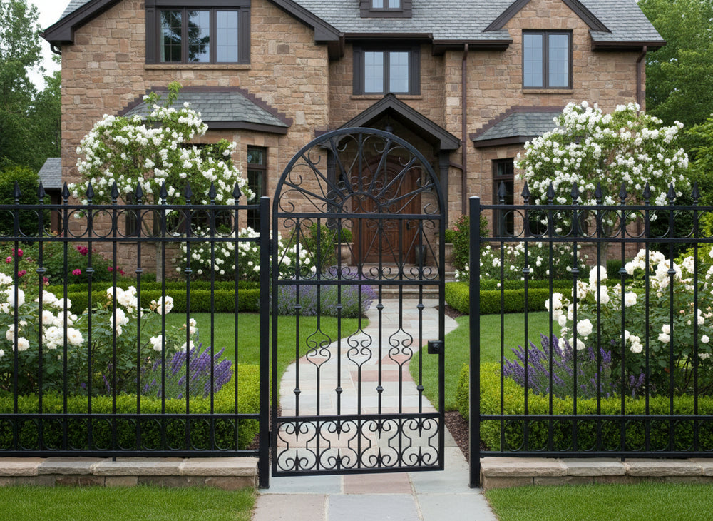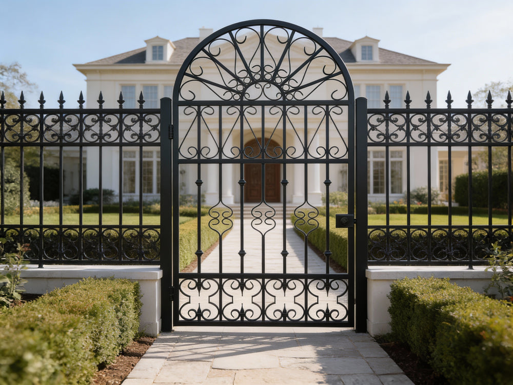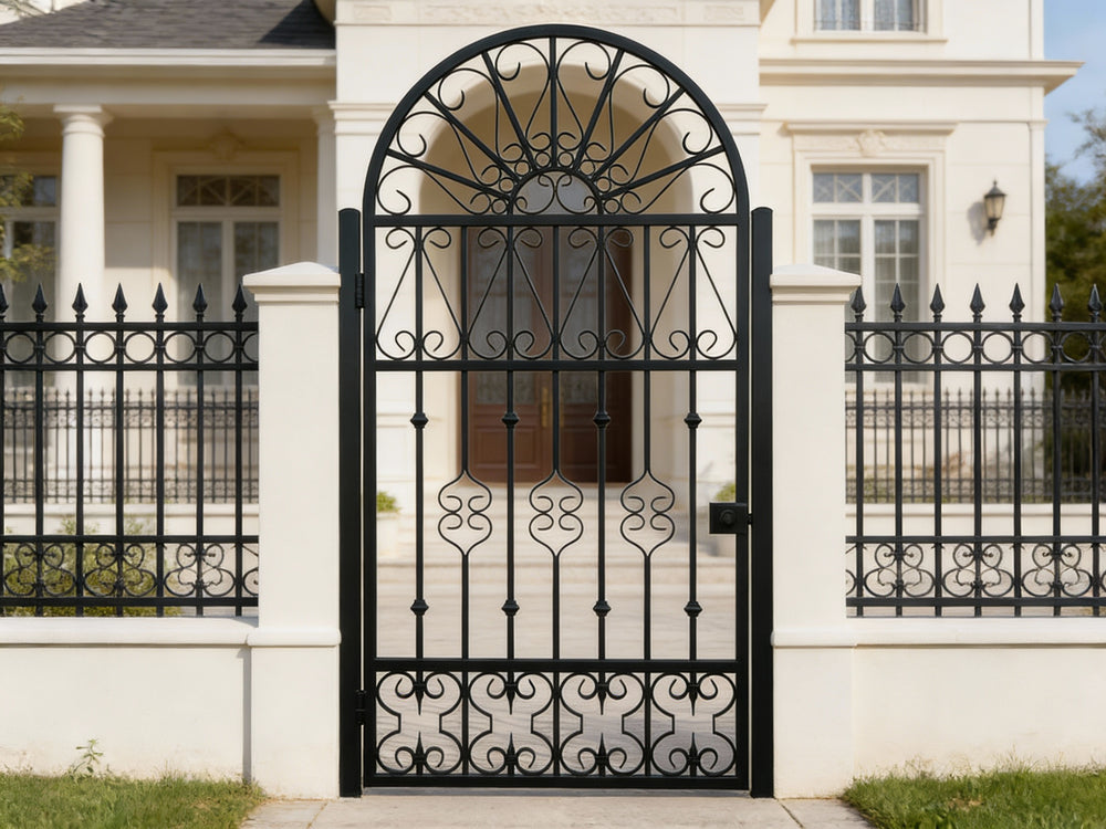 A door that radiates elegance. Fancrest Passage features a graceful arched top with a fan-like scroll arrangement, mirrored floral motifs, and vertical bar lattice. The bottom panel adds rhythmic scrollwork, while the right-side latch and left-side hinge ensure smooth manual operation. Designed for garden entries, residential walkways, or courtyard transitions, this man door blends ornamental artistry with secure craftsmanship.