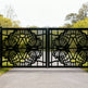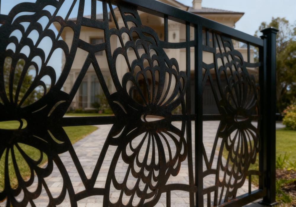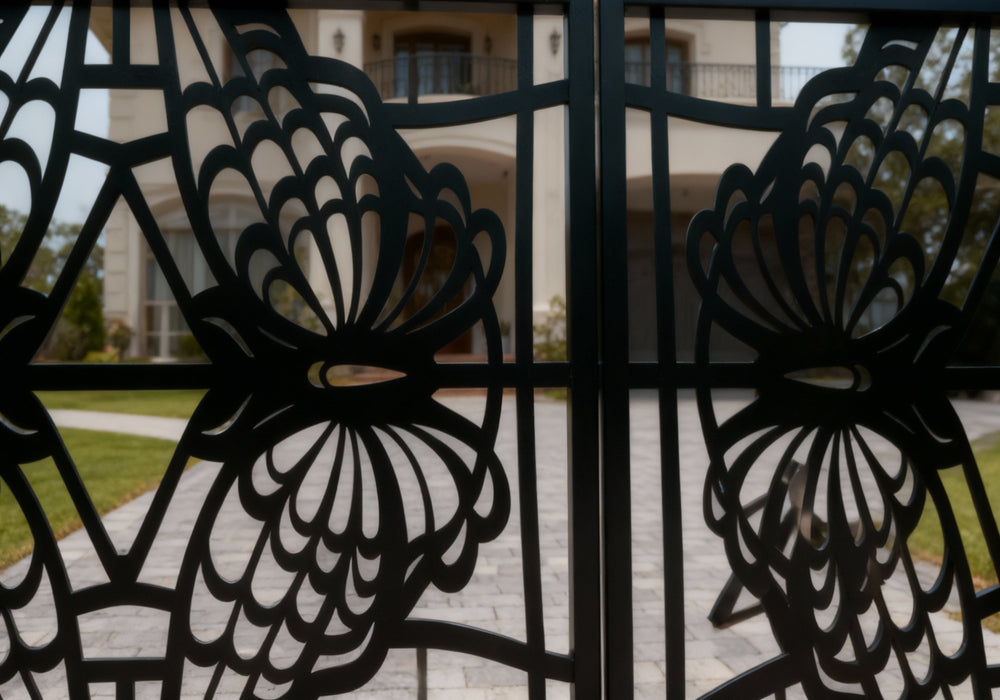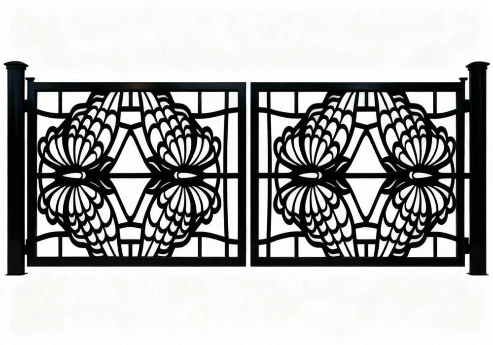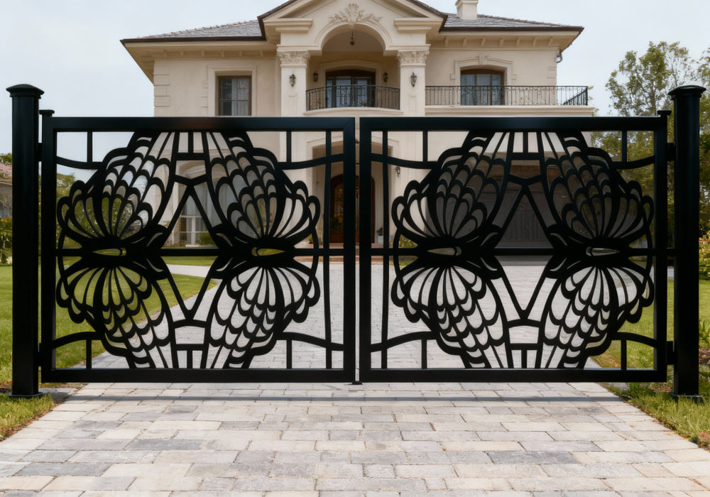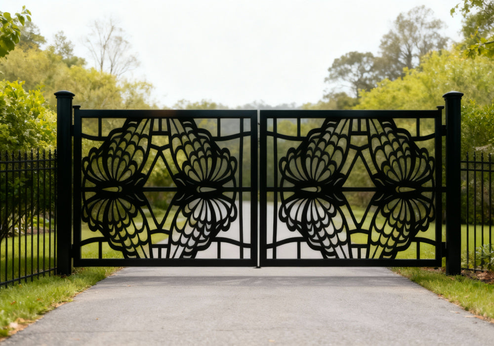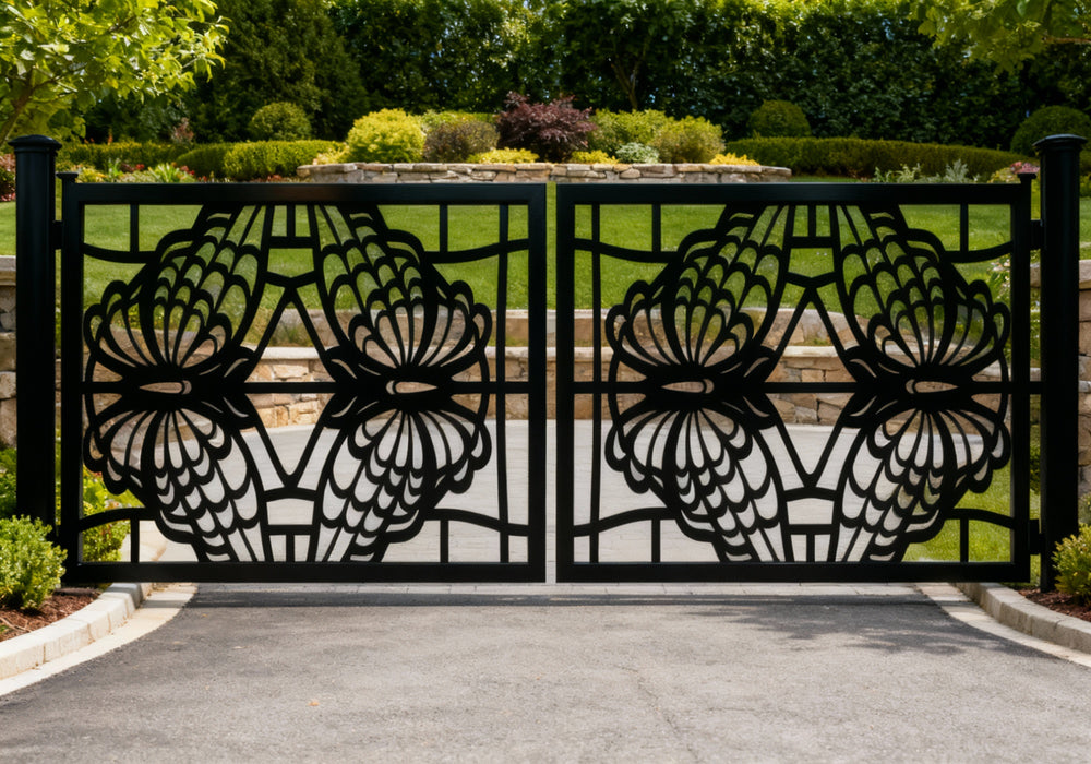 A sculptural pair that reads like motion frozen in metal. FeatherRadiant pairs radiating feather or leaf blades around a central diamond, producing a mirrored composition that feels both organic and architectural. This design works as a dramatic driveway gate or a statement fence panel for modern-classical estates, galleries, and boutique commercial entries.