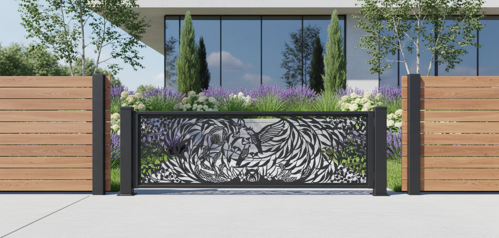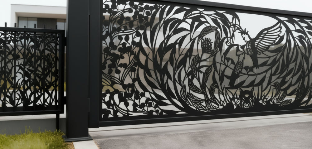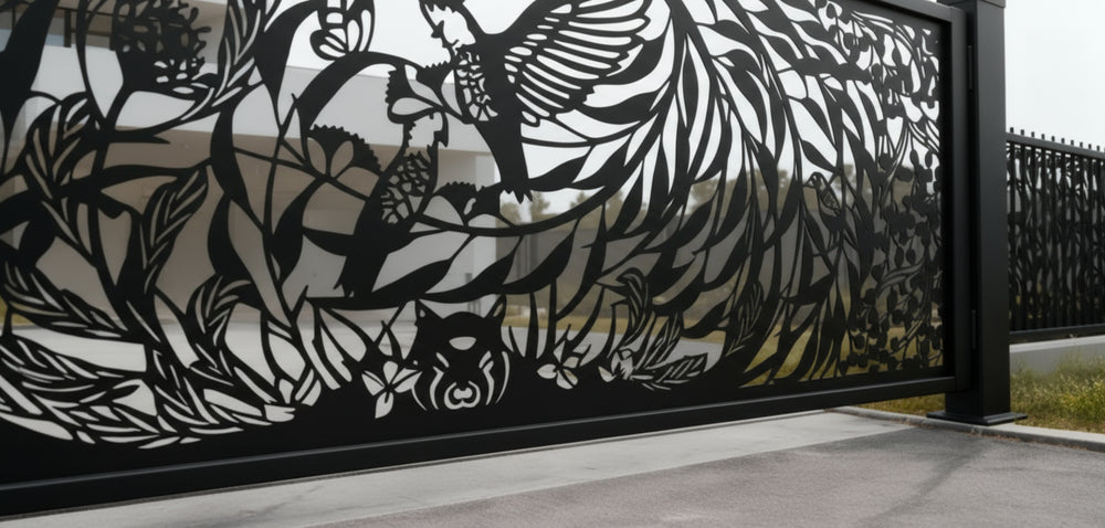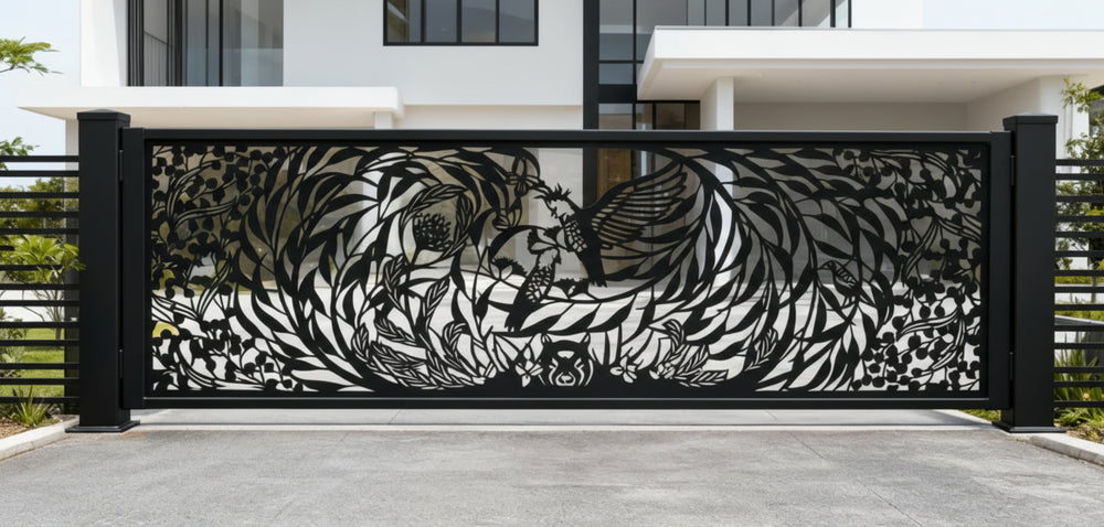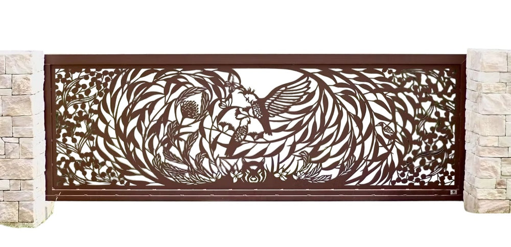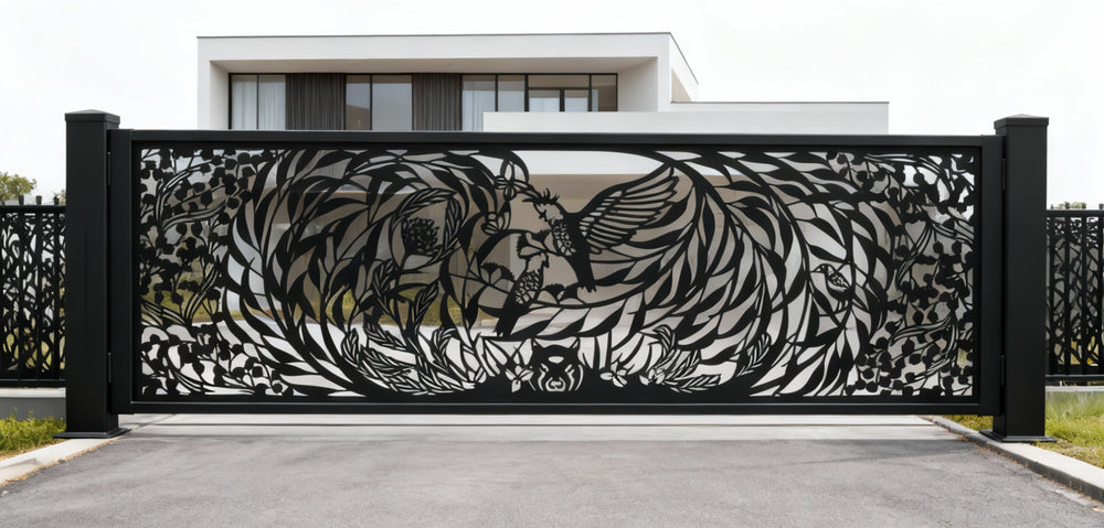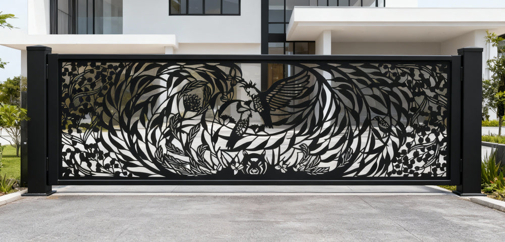Celebrate the harmony of nature and craftsmanship with our Driveway Gate, an exquisite plasma-cut steel masterpiece that transforms your entrance into a work of art, inspired by the joyful call of the beauty of native flora.