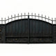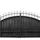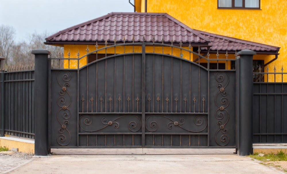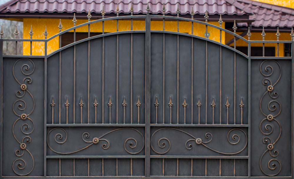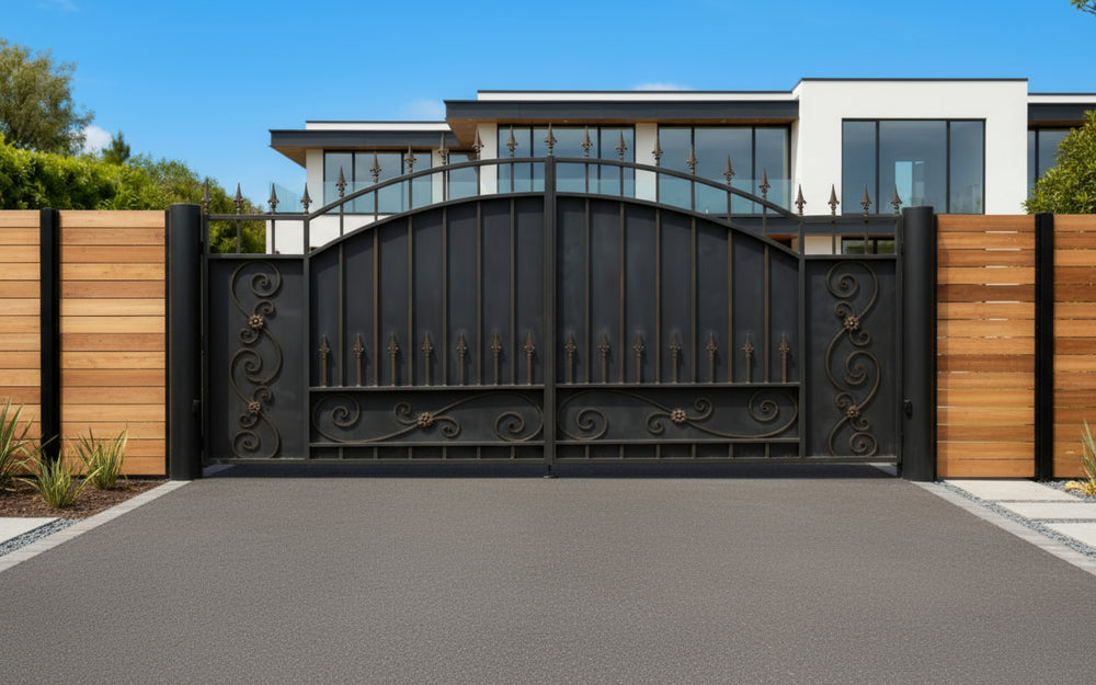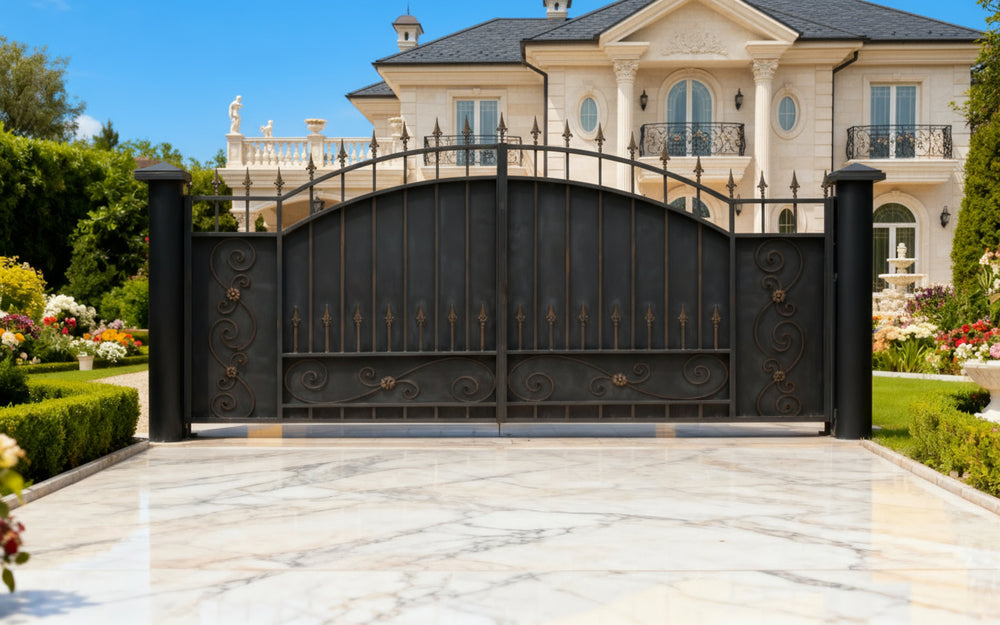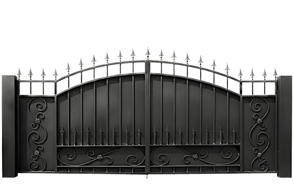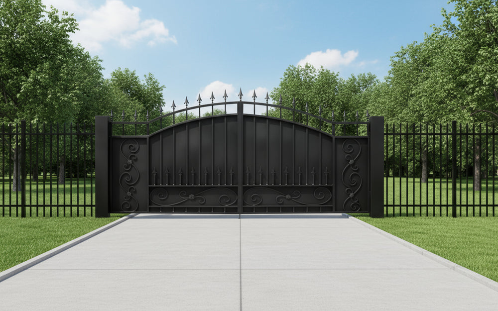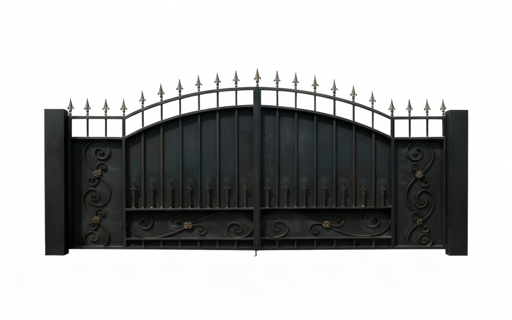 A gate that rises with rhythm and grace. Finial crest Aria features dual swing panels with vertical bars topped by pointed fleur-de-lis finials, anchored by ornate scrollwork and floral motifs along the lower section. The arched top rail adds architectural lift, while the symmetrical layout and solid pillars provide strength and balance. This design evokes classical elegance and modern durability.