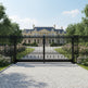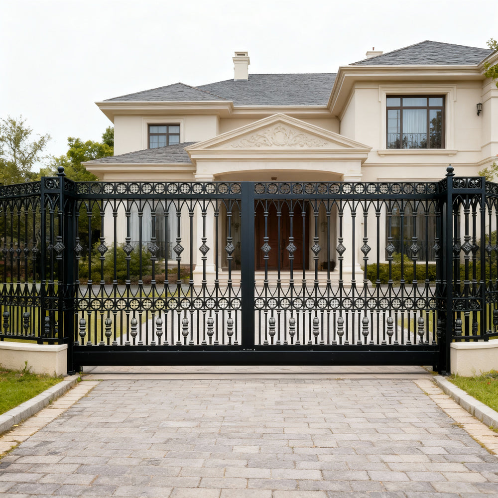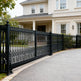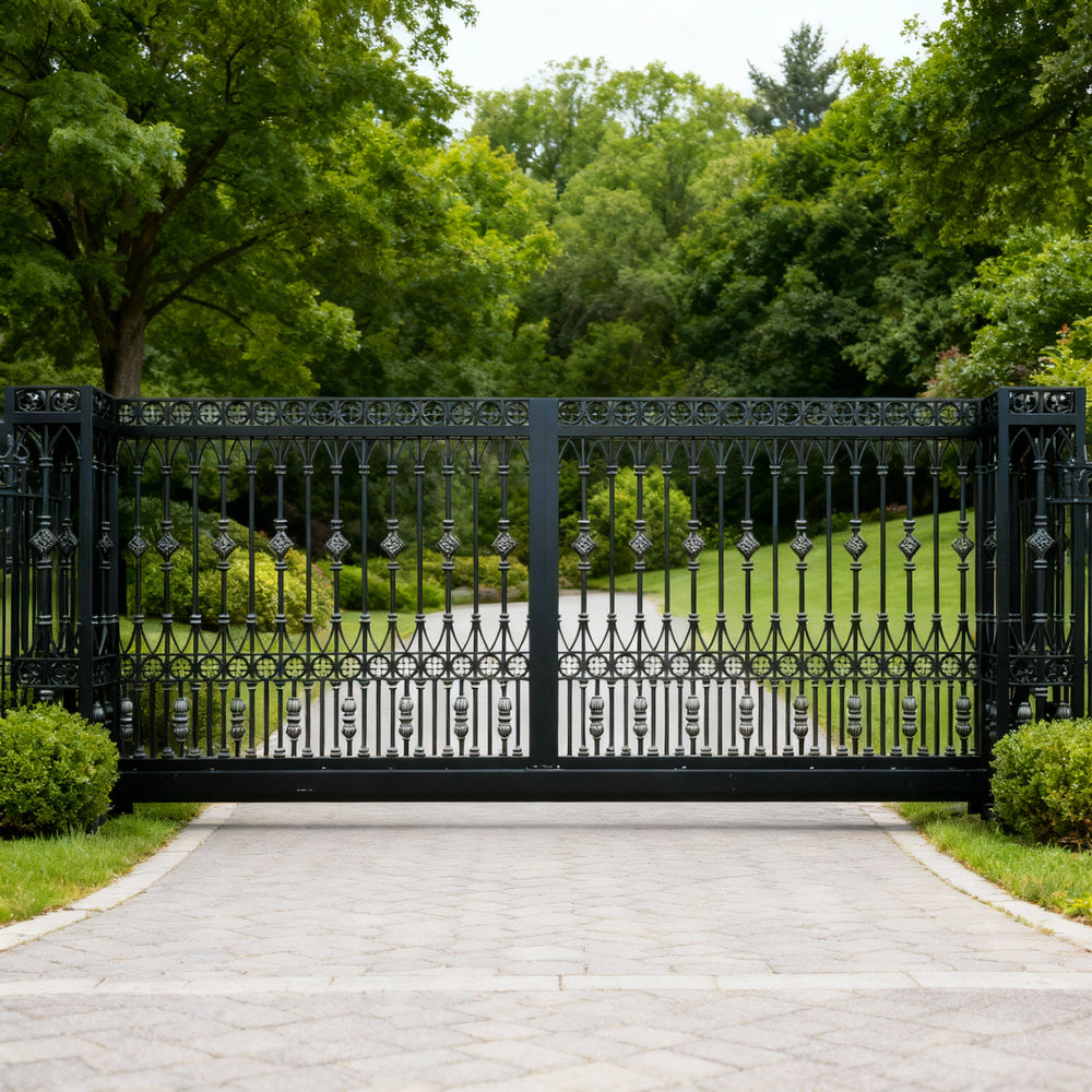 A gate that guards with grace. Finial path Estate Gate features dual swing panels with vertical bars topped by pointed finials, framed by ornamental scrollwork and symmetrical detailing. The arched silhouette adds architectural lift, while the surrounding manicured greenery and tree-lined backdrop create a serene, estate-worthy setting. This design evokes strength, refinement, and timeless appeal.