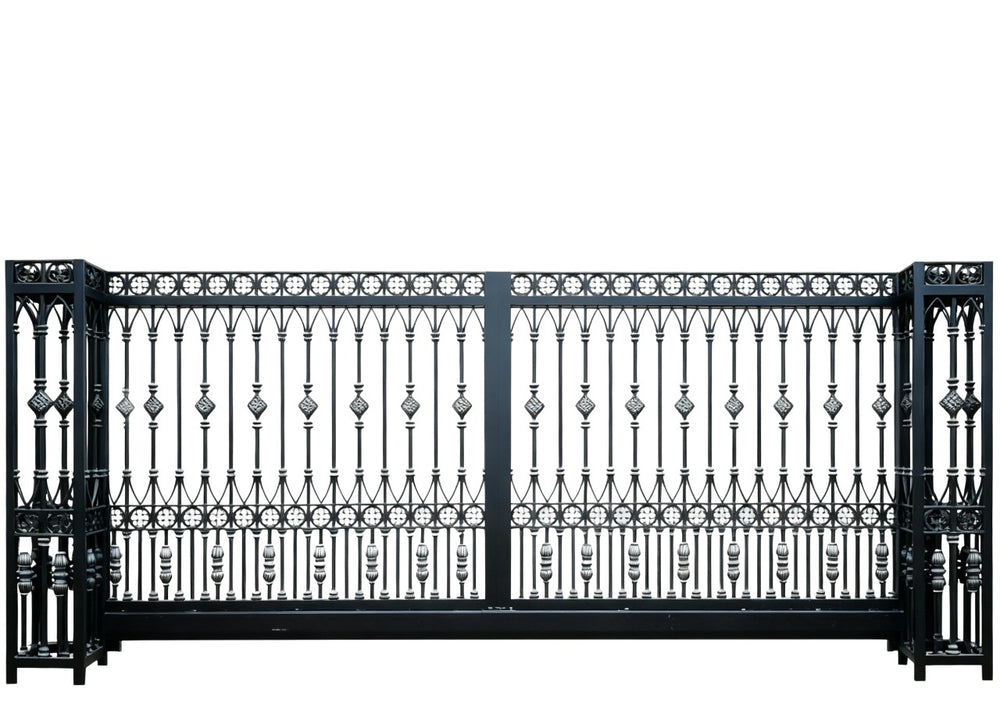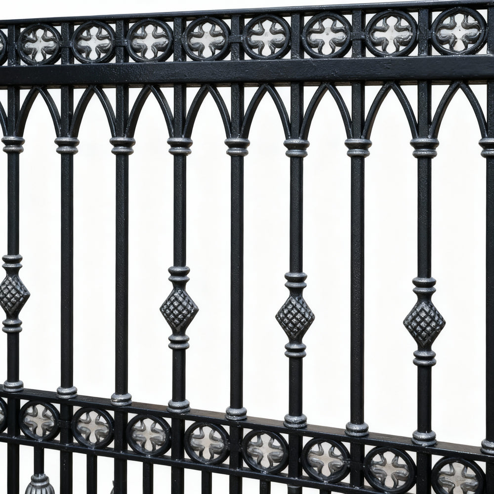 - Design: Finials, scrollwork, vertical bars, and arched silhouette