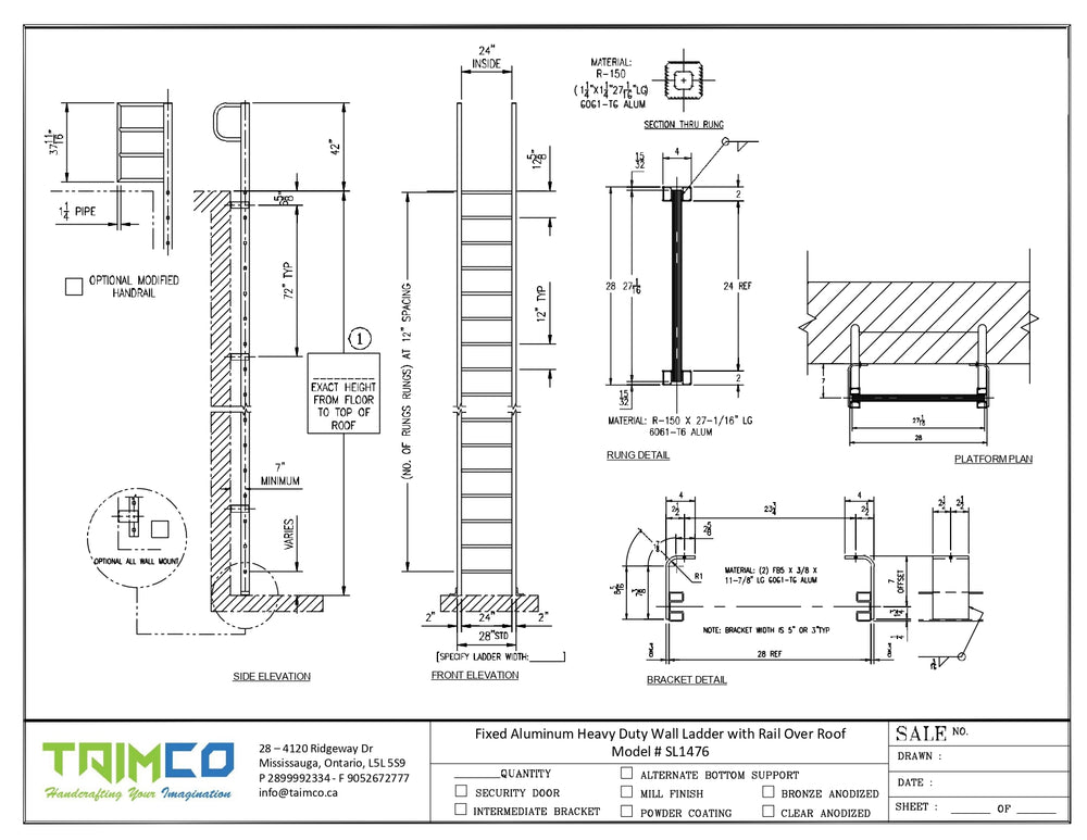 TAIMCO aluminum ladders and their components are fabricated from 6061-T6 aluminum alloy for added safety, strength, and long-lasting durability, with no painting required. Model SL1475 fixed wall ladders include side rails with 1-1/8" (29 mm) round rungs that are serrated and secured with cast aluminum connectors, 4 solid rivets, and 3/8" (9.5 mm) thick brackets mounted to the walls.